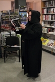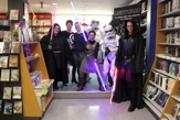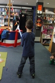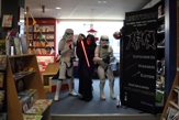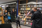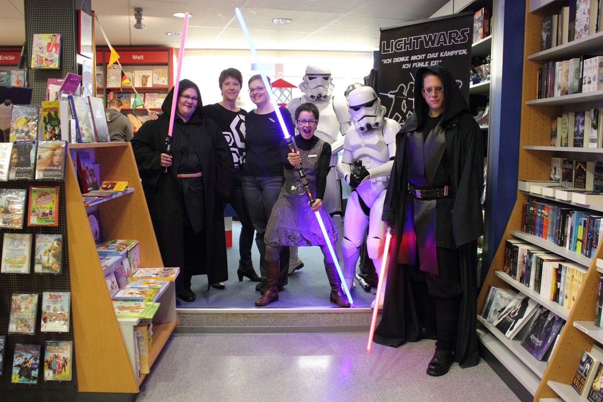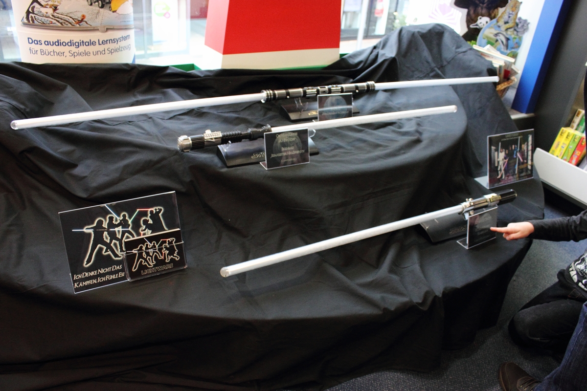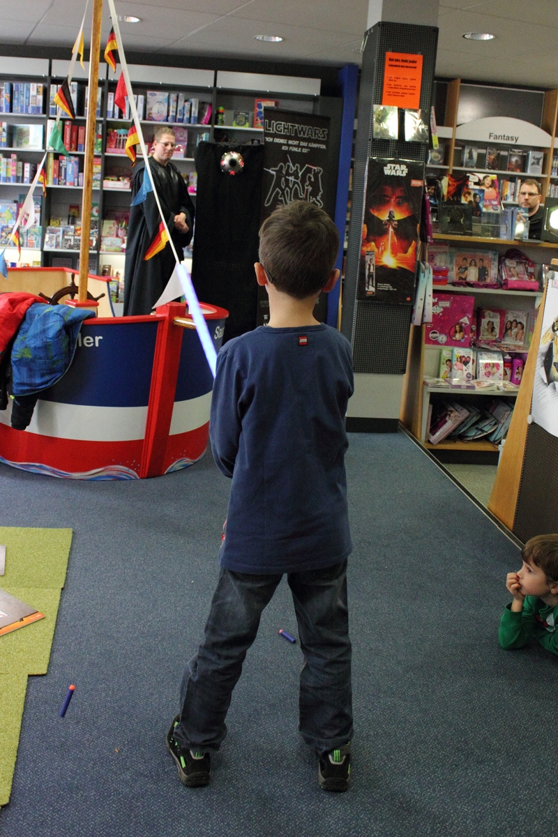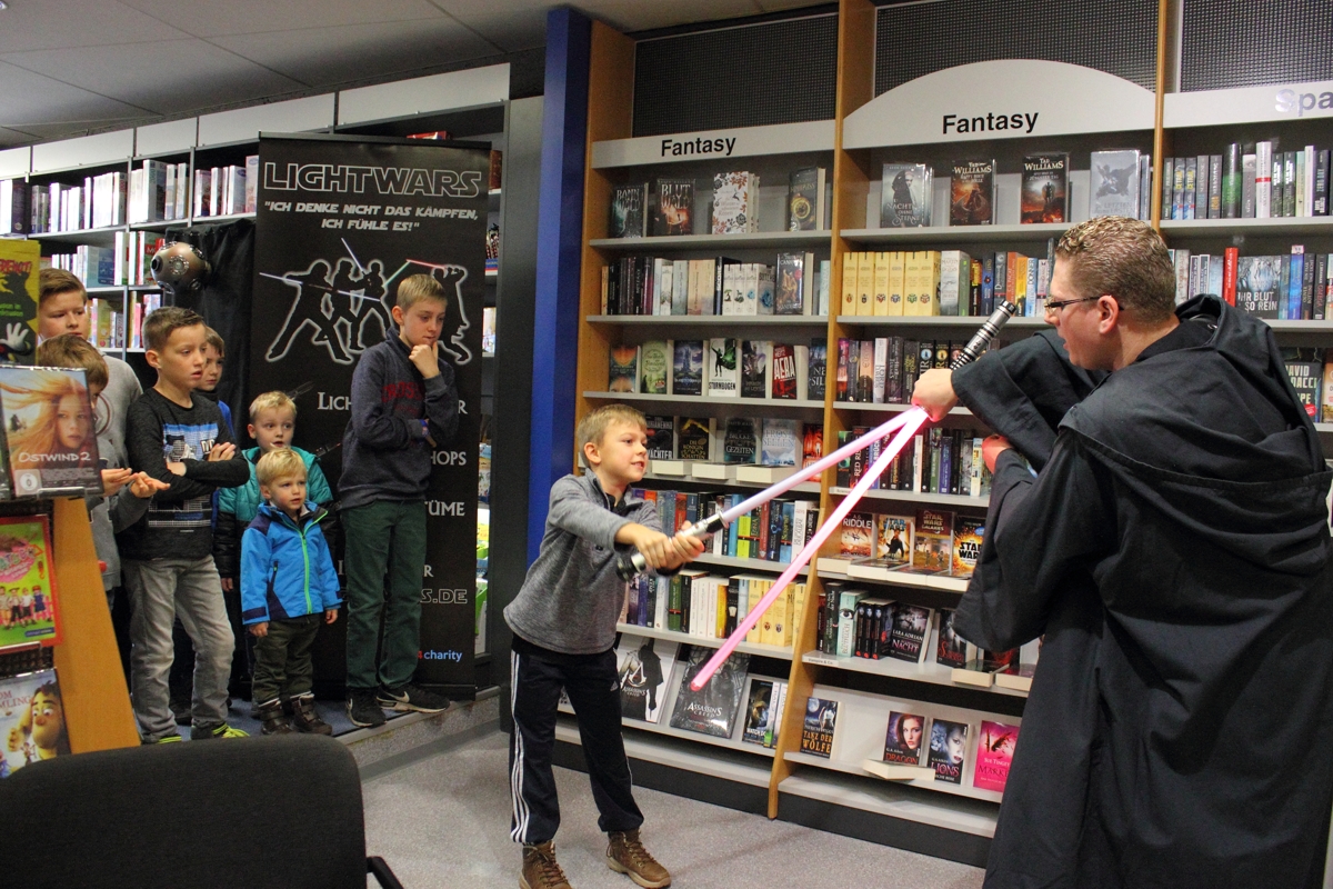 Darüber hinaus hatten sie bei uns die Möglichkeit, ihre Fähigkeiten und Reflexe mit dem Lichtschwert zu trainieren.  Inmitten von unzähligen Büchern hieß es dann die Klingen zu kreuzen oder sich der Trainingskugel zu stellen, was allen Beteiligten einen riesen Spaß machte.