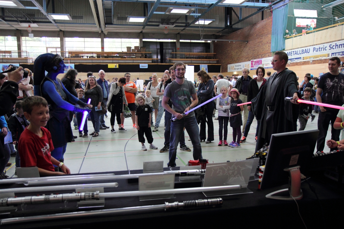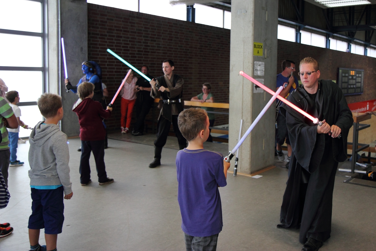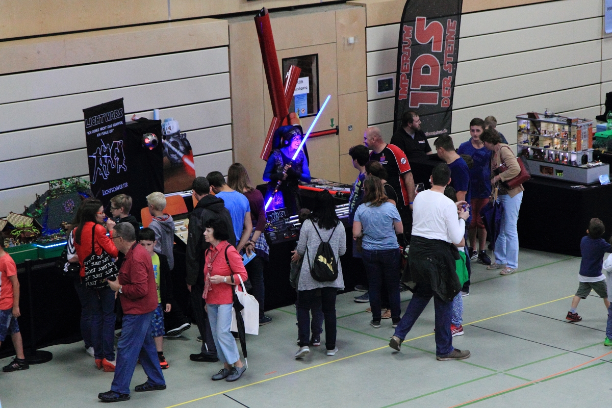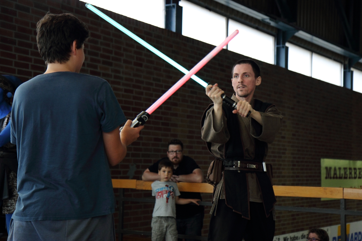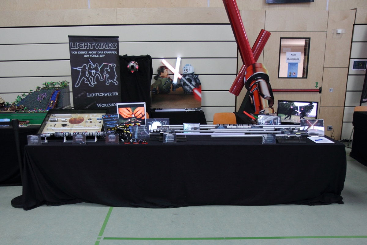 Sowohl am Samstag als auch am Sonntag gaben wir zwei große Lichtschwertworkshops. Beide waren sehr gut besucht und verlangten uns wegen der großen Teilnehmerzahl einiges ab. Die angenehm große Fläche für den Workshop befand sich im oberen Teil der Halle und bot uns während des Trainings eine tolle Aussicht auf die gesamte Ausstellung. Auch am Stand hatten wir jede Menge Platz für kleinere Trainingseinheiten mit begeisterten Besuchern und den Einsatz unserer beliebten Trainingskugel.