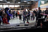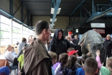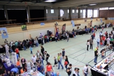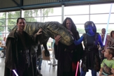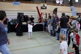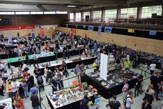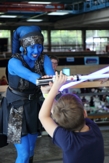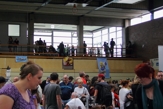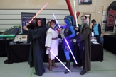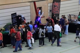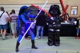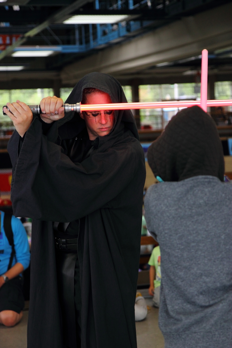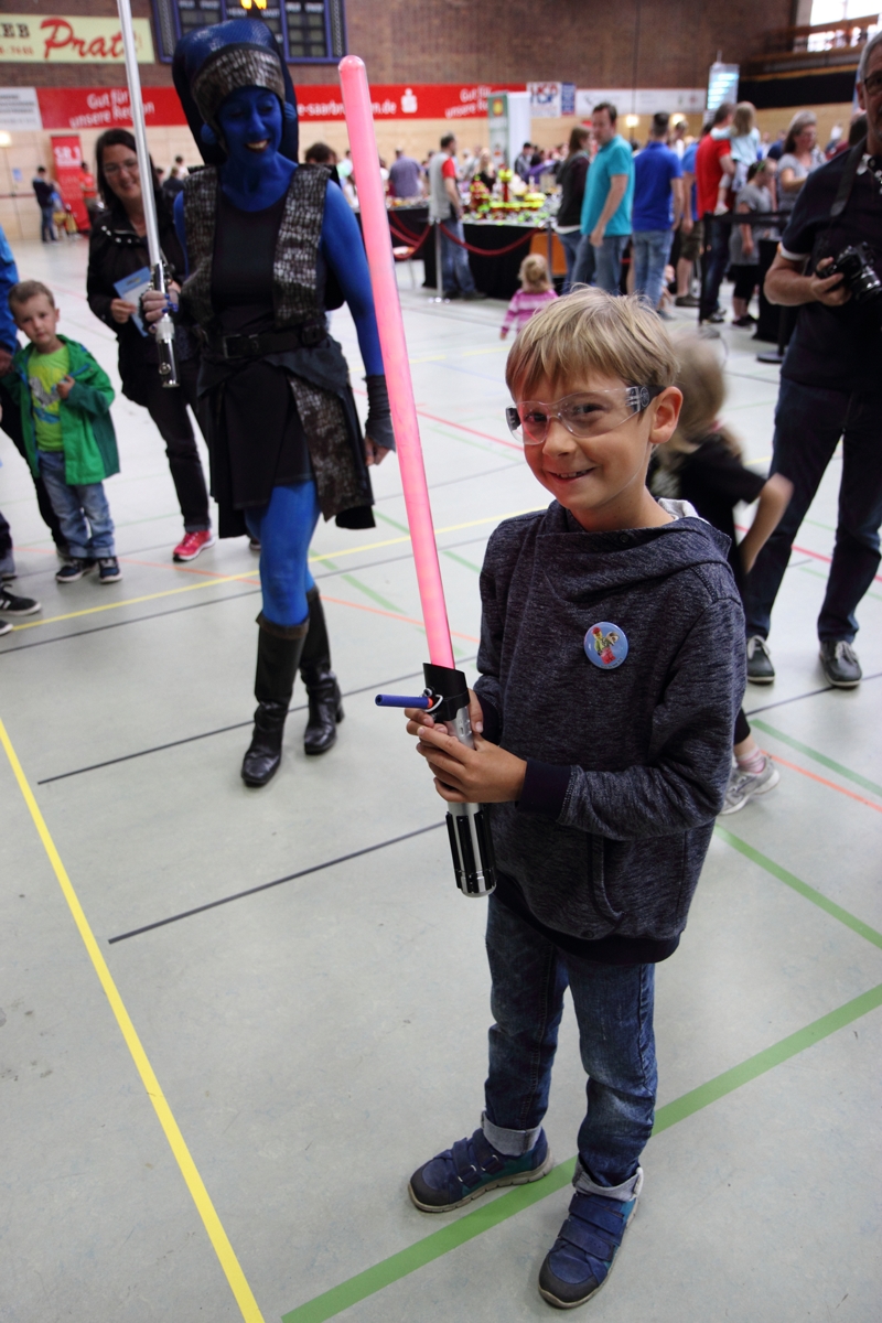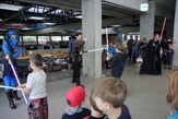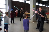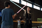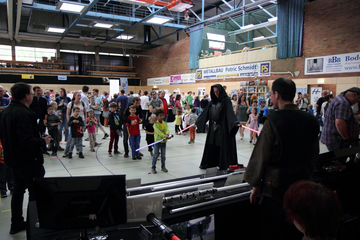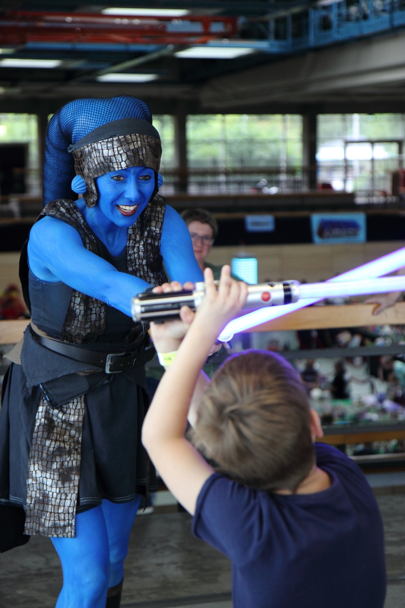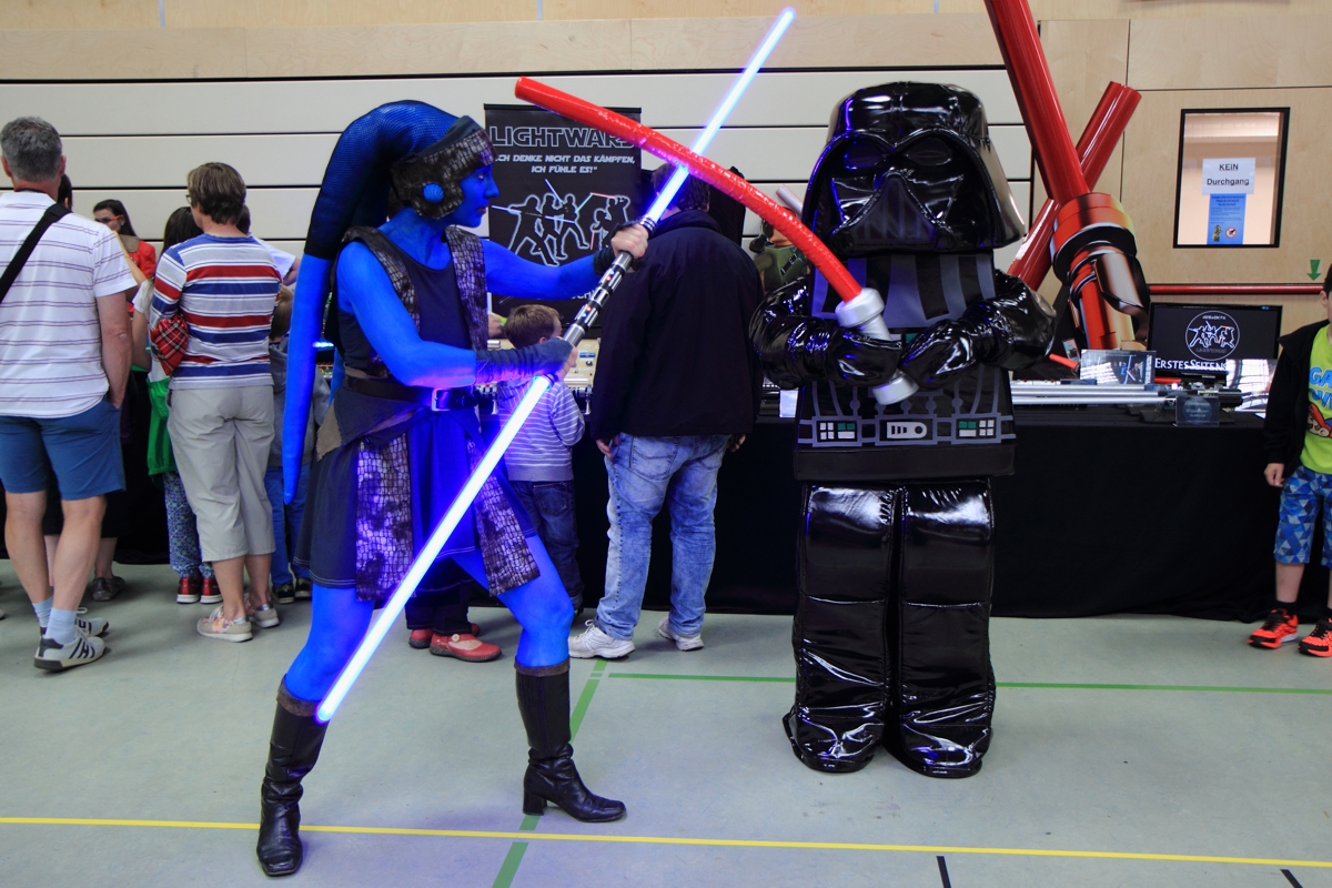 Sowohl am Samstag als auch am Sonntag gaben wir zwei große Lichtschwertworkshops. Beide waren sehr gut besucht und verlangten uns wegen der großen Teilnehmerzahl einiges ab. Die angenehm große Fläche für den Workshop befand sich im oberen Teil der Halle und bot uns während des Trainings eine tolle Aussicht auf die gesamte Ausstellung. Auch am Stand hatten wir jede Menge Platz für kleinere Trainingseinheiten mit begeisterten Besuchern und den Einsatz unserer beliebten Trainingskugel.