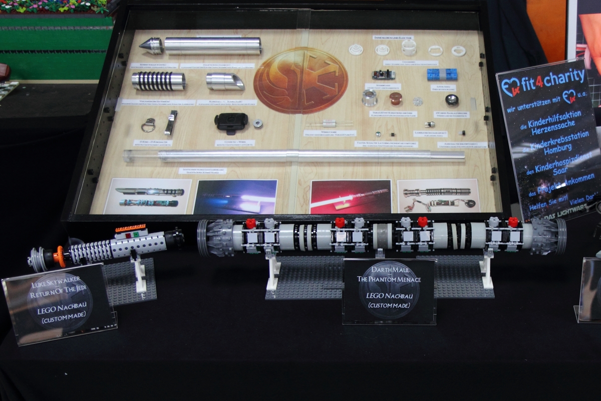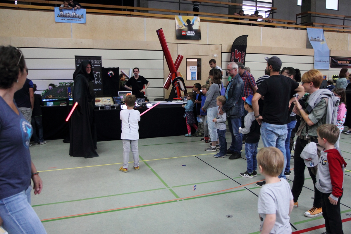 Unser Stand befand sich auf der Ausstellerfläche inmitten dieser fantastischen Legobauten. Eigens für diese gigantische Ausstellung haben wir ein Darth Maul TPM und ein Luke ROTJ aus Legosteinen selbst nachgebaut. Sie zierten über das Wochenende unseren Stand ebenso wie ein selbst nachgebauter E-Wing Fighter.