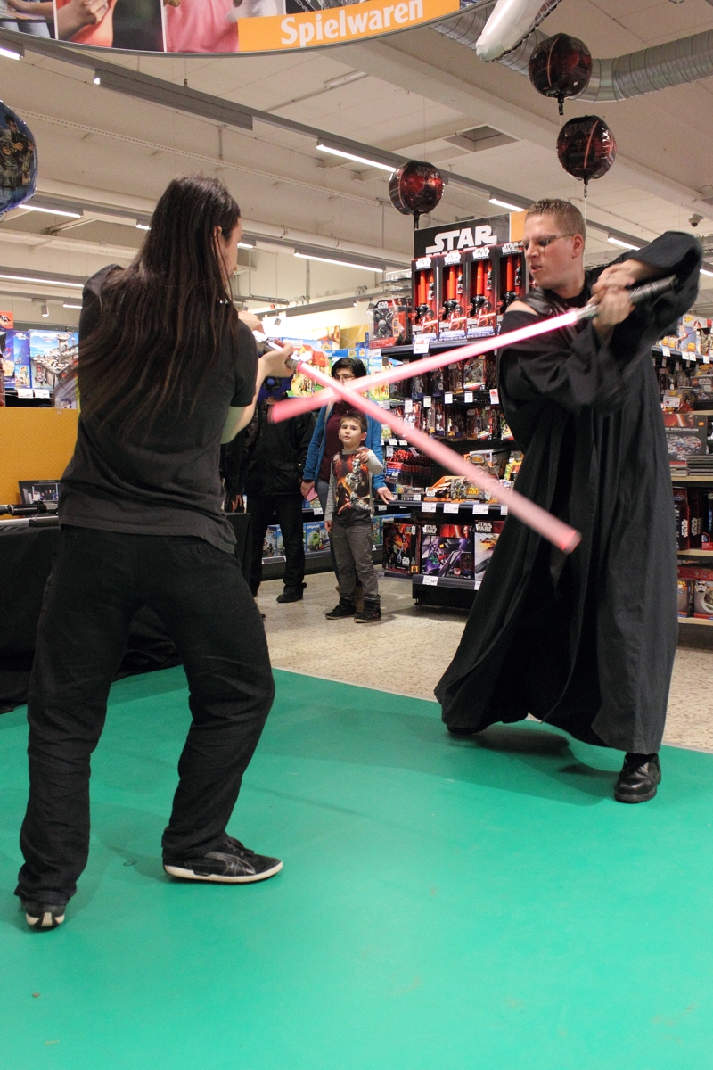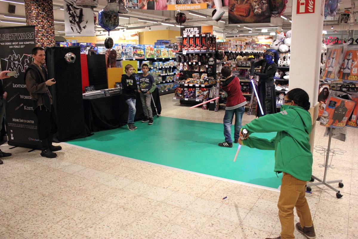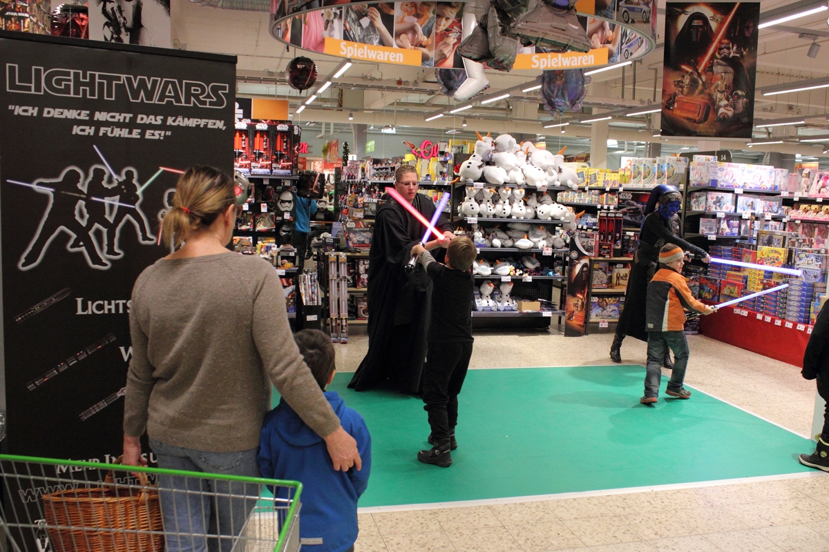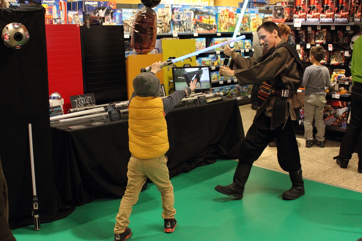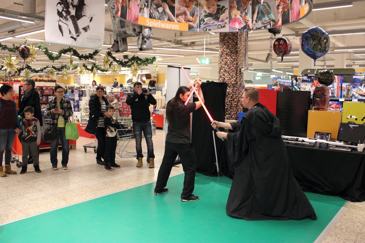 In vorweihnachtlicher Atmosphäre begeisterten wir zwischen 11 Uhr und 18 Uhr große und kleine Einkäufer. Das Interesse bei uns ein Lichtschwerttraining zu absolvieren war enorm groß, ebenso wie der Wunsch, die eigenen Reflexe an der Trainingskugel zu schulen. Man konnte unsere Lichtschwerter bestaunen, mit uns “fachsimpeln” bzw. Fotos machen oder einfach nur dem bunten Treiben zuschauen.