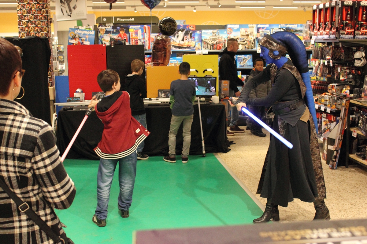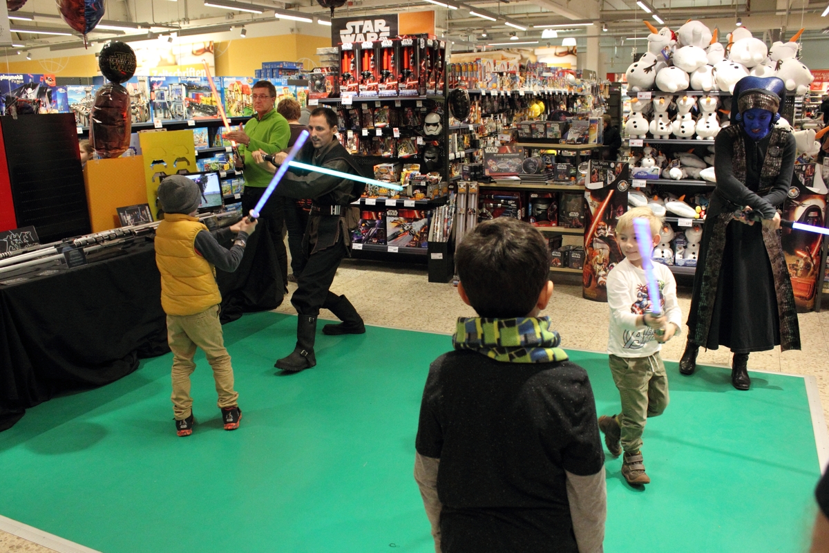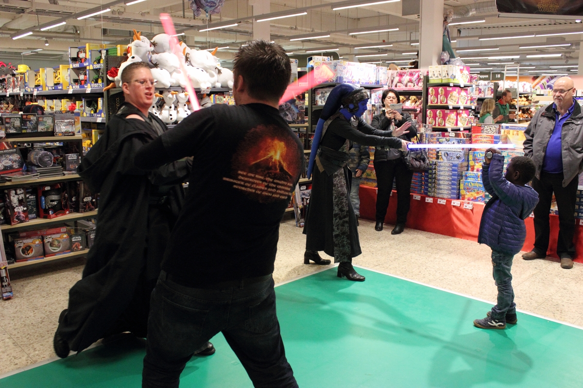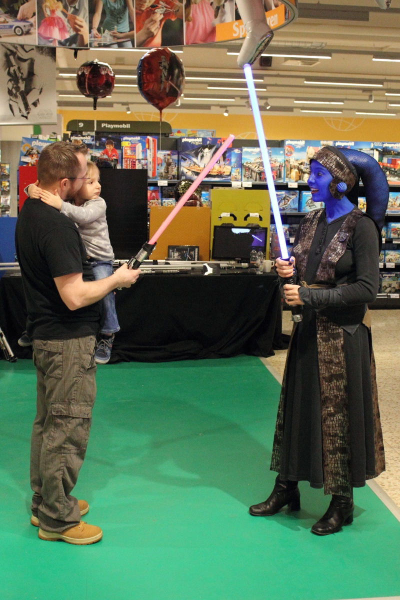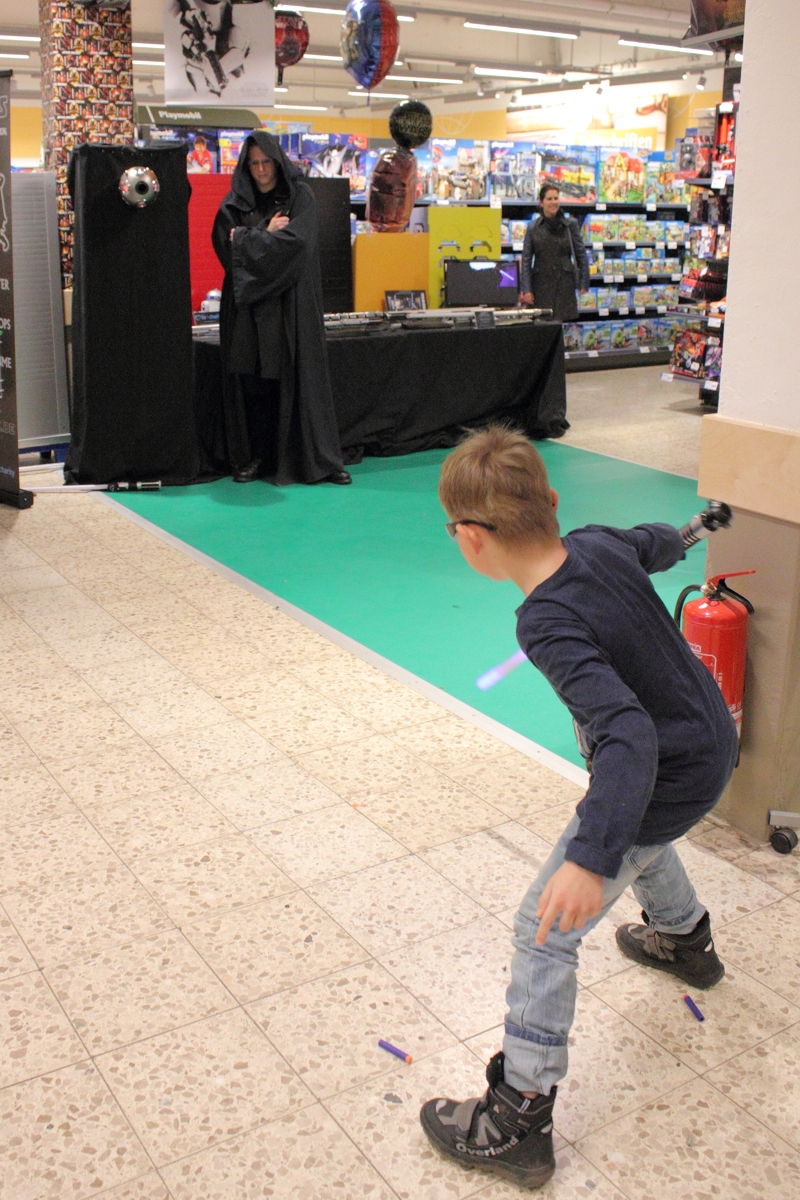 In vorweihnachtlicher Atmosphäre begeisterten wir zwischen 11 Uhr und 18 Uhr große und kleine Einkäufer. Das Interesse bei uns ein Lichtschwerttraining zu absolvieren war enorm groß, ebenso wie der Wunsch, die eigenen Reflexe an der Trainingskugel zu schulen. Man konnte unsere Lichtschwerter bestaunen, mit uns “fachsimpeln” bzw. Fotos machen oder einfach nur dem bunten Treiben zuschauen.