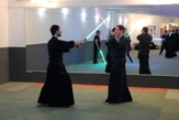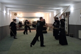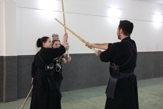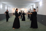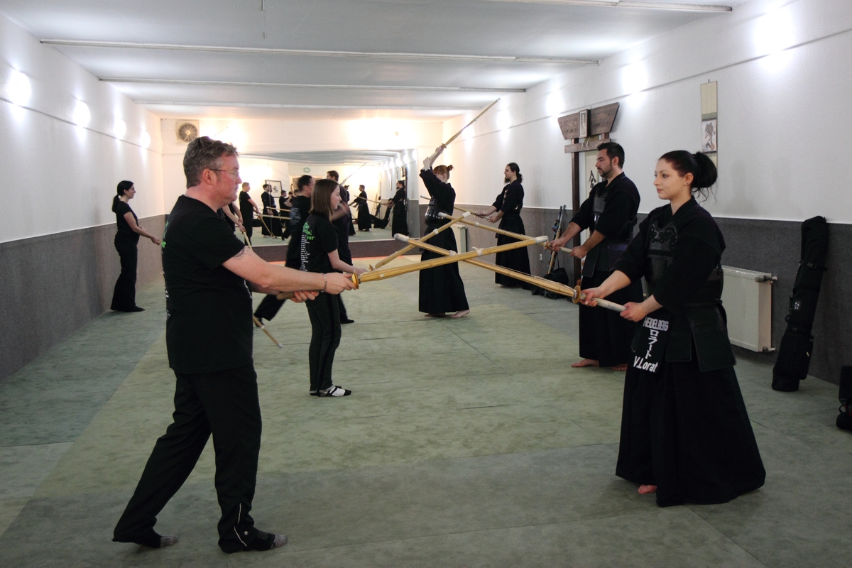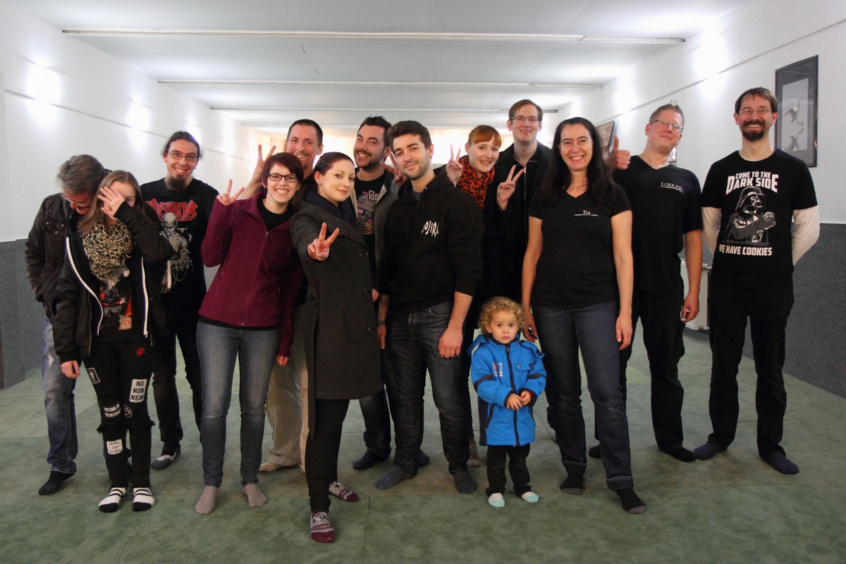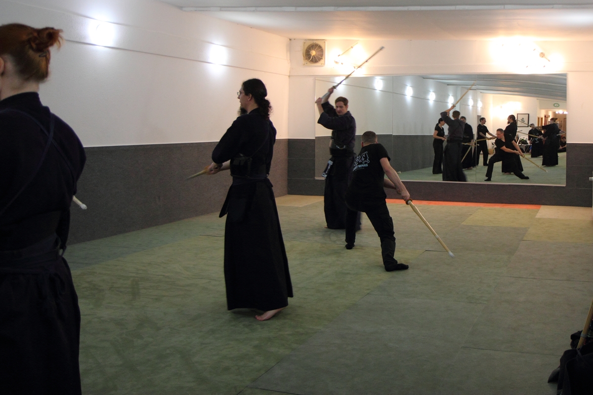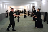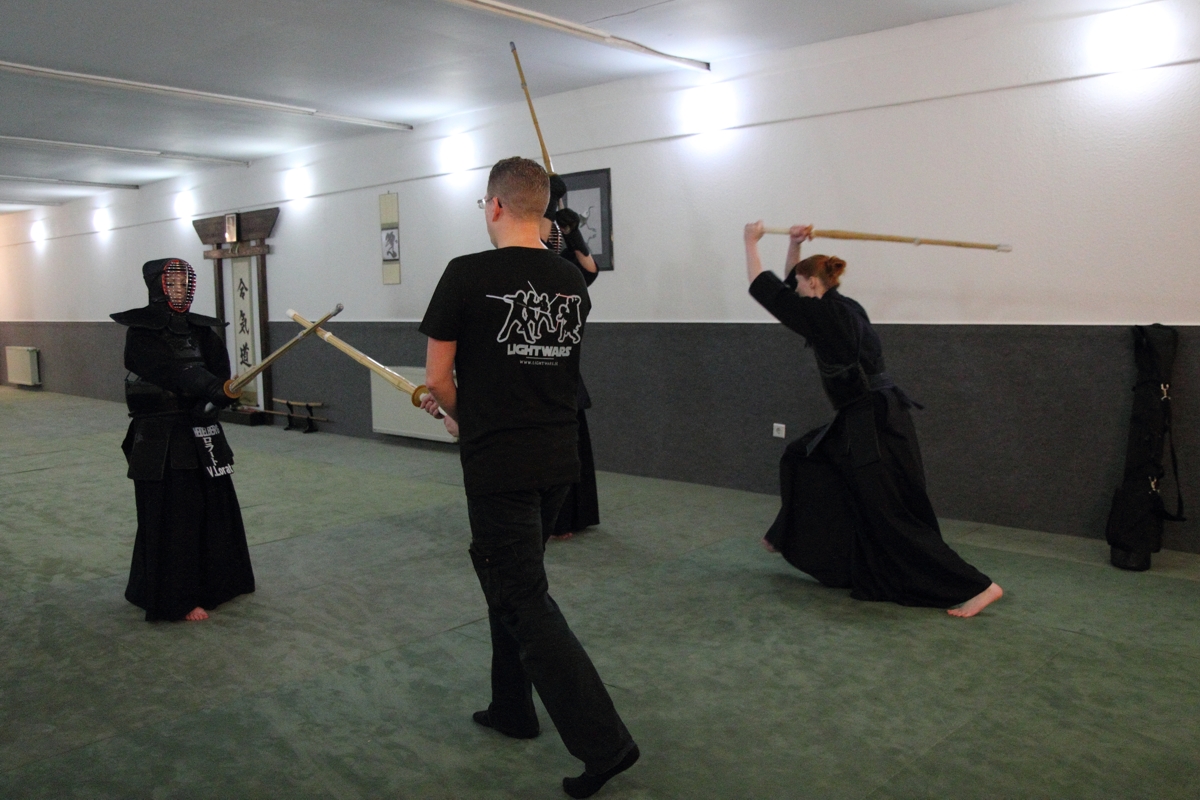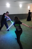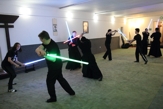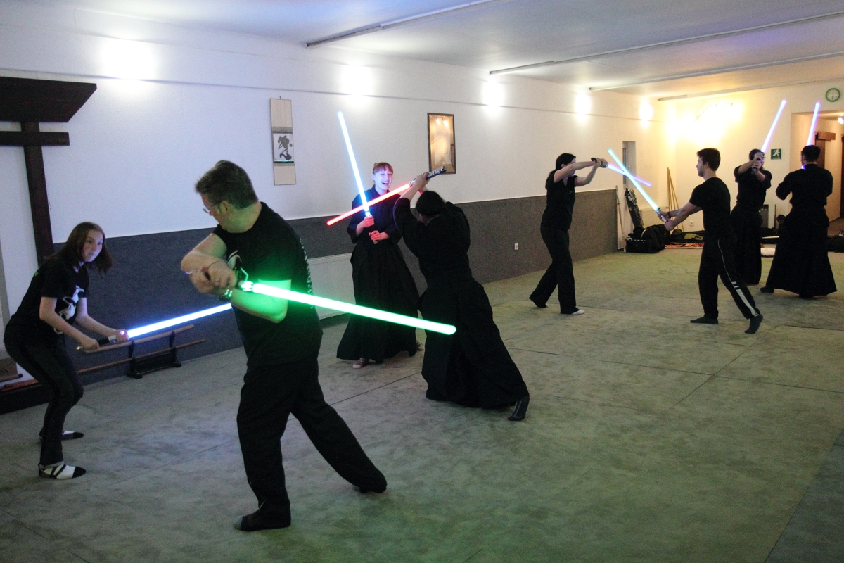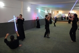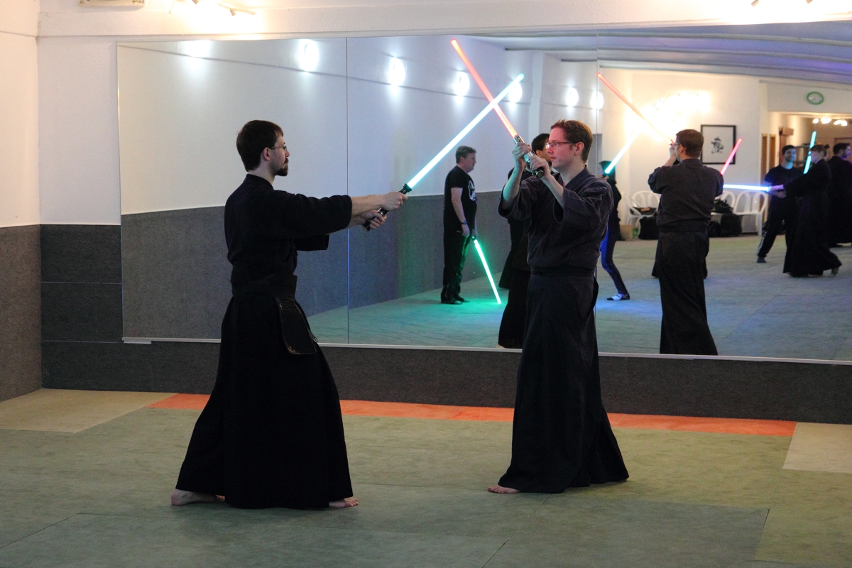 In den ersten beiden Stunden unterwiesen wir die Kendôgruppe in den Grundlagen des Lichtschwertkampfes und der Lichtschwertchoreographie. Zunächst erklärten wir die allgemeinen Regeln zur Erarbeitung einer Choreographie und führten Übungen durch, in denen die standardmäßigen Elemente wie die grundlegenden und erweiterten Trefferzonen, das Schlag- und Blocksystem sowie die Bewegungsabläufe ausgeführt wurden. Danach erarbeiteten sich die Sparringspartner eine eigene Schlagfolge. Wir zeigten dann in weiteren Übungen komplexere Elemente, welche das Repertoire der Trainierenden erweiterten und nach und nach von diesen in ihre Schlagfolge eingebaut werden konnten. So entstanden am Ende bei allen Trainingspartnern selbstständig erarbeitete, sehr leidenschaftliche Lichtschwertchoreographien.