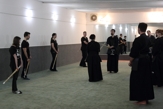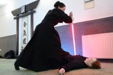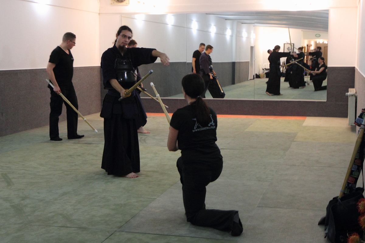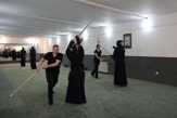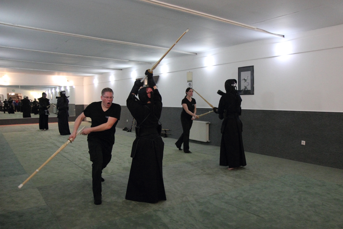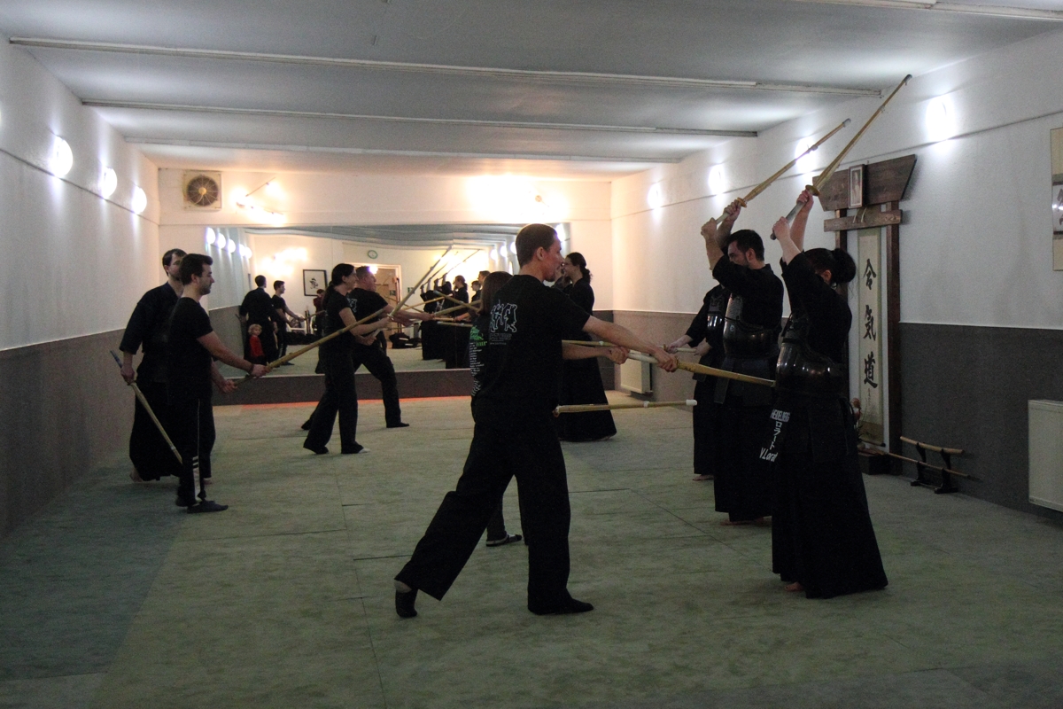 Im Anschluss an das Lichtschwerttraining wurden wir für zwei Stunden in die Welt des Kendô entführt und durften Erfahrungen sammeln mit dieser für uns neuen Art des Schwertkampfes. Zunächst erhielten wir eine Einführung in verschiedene Grundlagen wie Trefferzonen, korrekte Körperhaltung und richtiges Bewegungsverhalten, die wir dann einübten. Über die Nihon Kendô Katas führte man uns anschließend weiter an die Kunst des Kendô heran. Verschiedene Katas wurden vorgeführt und erläutert sowie deren Bewegungsabläufe teilweise in der Lehrer-Schüler Situation mit uns umgesetzt. In weiteren Übungen wie beispielsweise der Saju-Men oder Kakari-geiko wurde dann die Dynamik gesteigert. Zum Abschluss des Kendô-Trainings erhielten wir in epischer Anmutung noch einmal die 10 Nihon Kendô Katas in voller Gänze und mit Lichtschwertern vorgeführt.