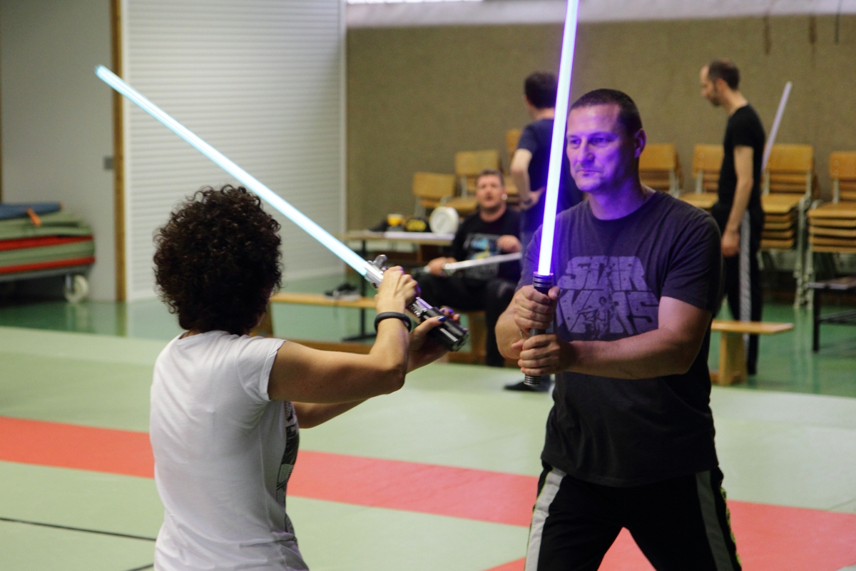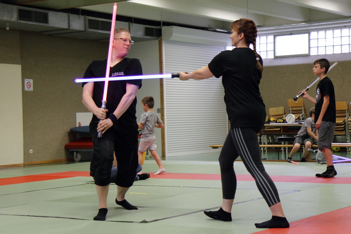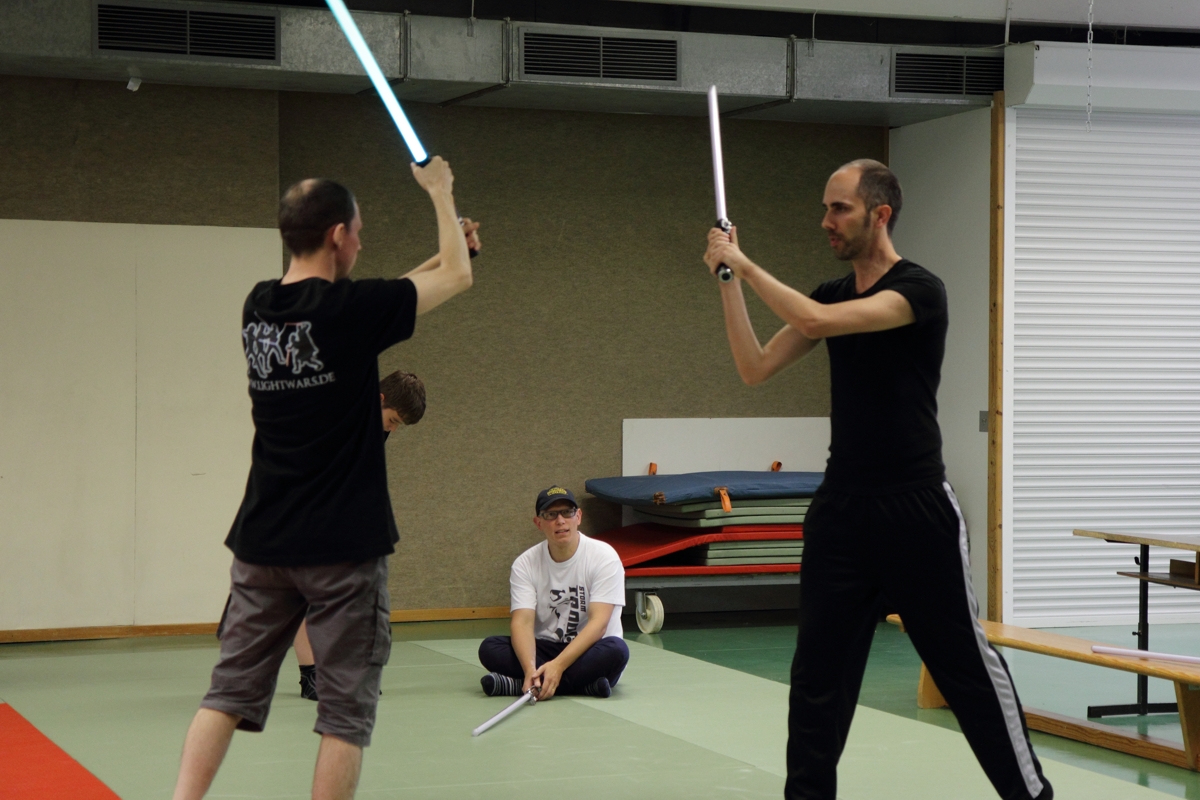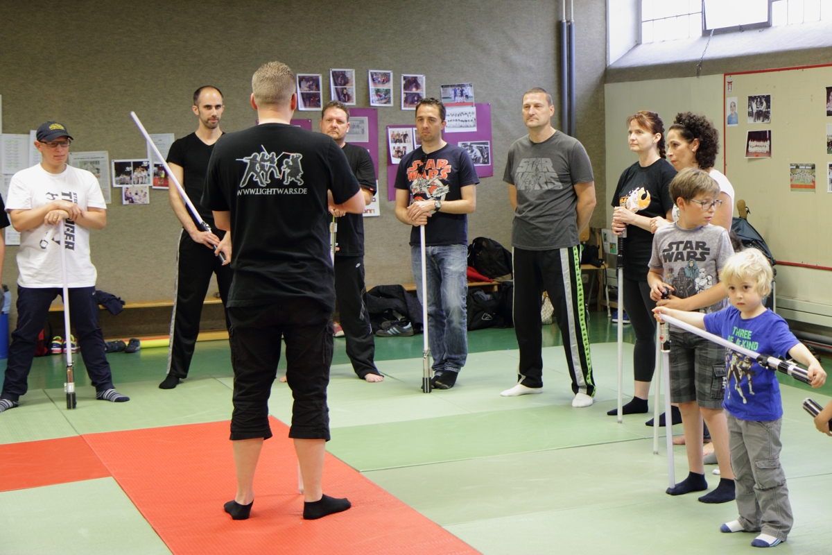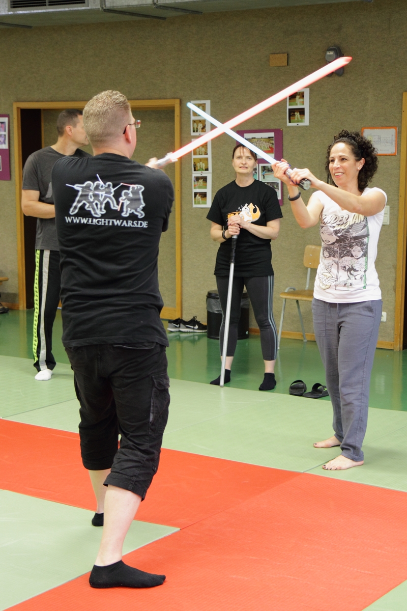 Nach einer kleinen Aufwärmphase starteten wir das Lichtschwerttraining mit unserem Grundlagenworkshop. Nach fast zwei Stunden gab es dann erst einmal eine Verschnaufpause in der wir reichlich mit leckerem Gebäck und Getränken versorgt wurden. Anschließend startete die zweite Runde mit weiterführenden und vertiefenden Übungen. Die Judohalle war die ganze Zeit über erfüllt mit den Swing- und Clashsounds der Lichtschwerter der Teilnehmer. Wo man hinsah wurde mit viel Spaß, aber auch Ehrgeiz und Konzentration, gefochten. Ein Anblick, der für jeden Lichtschwertfan wohl kaum zu vergessen ist.