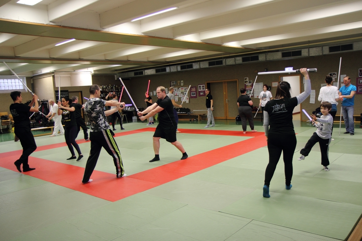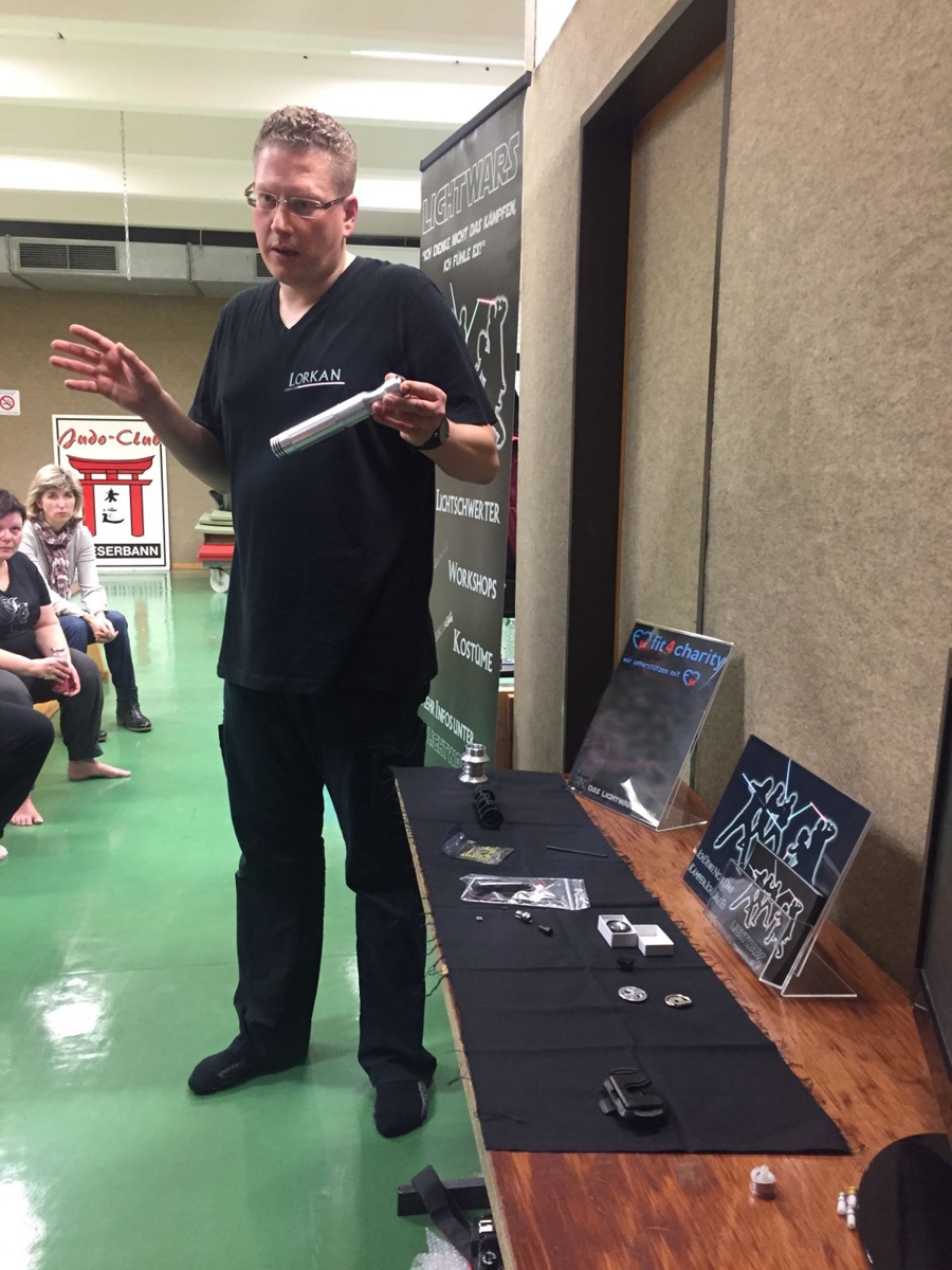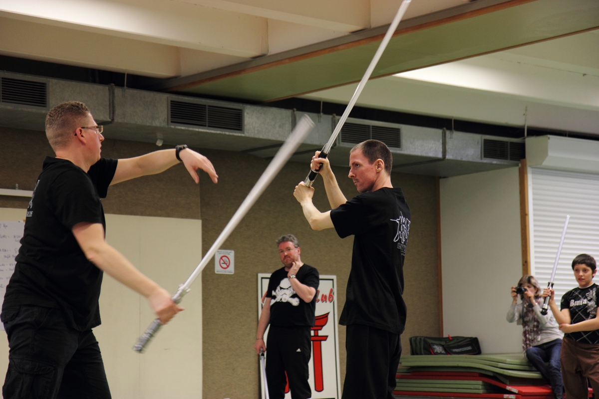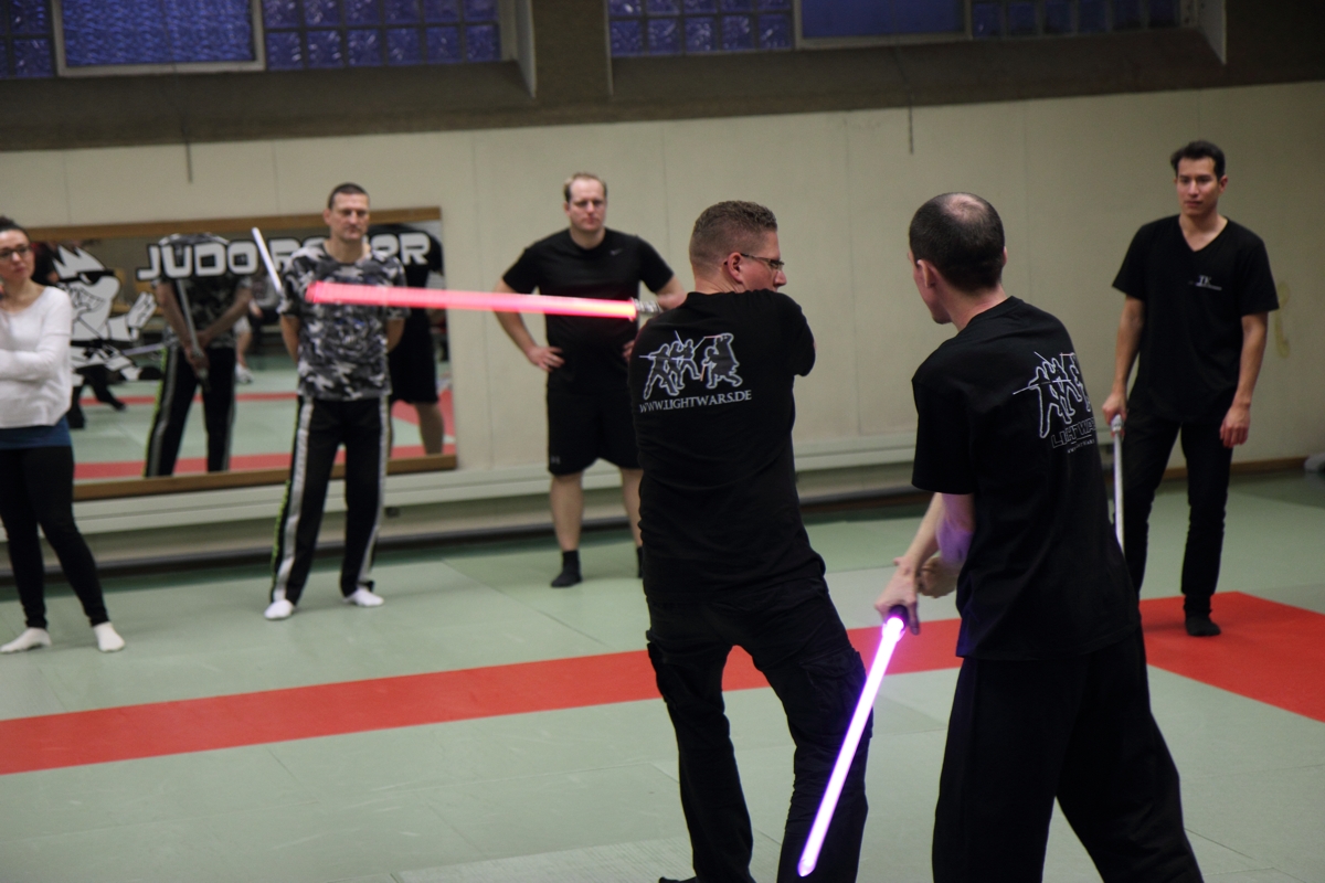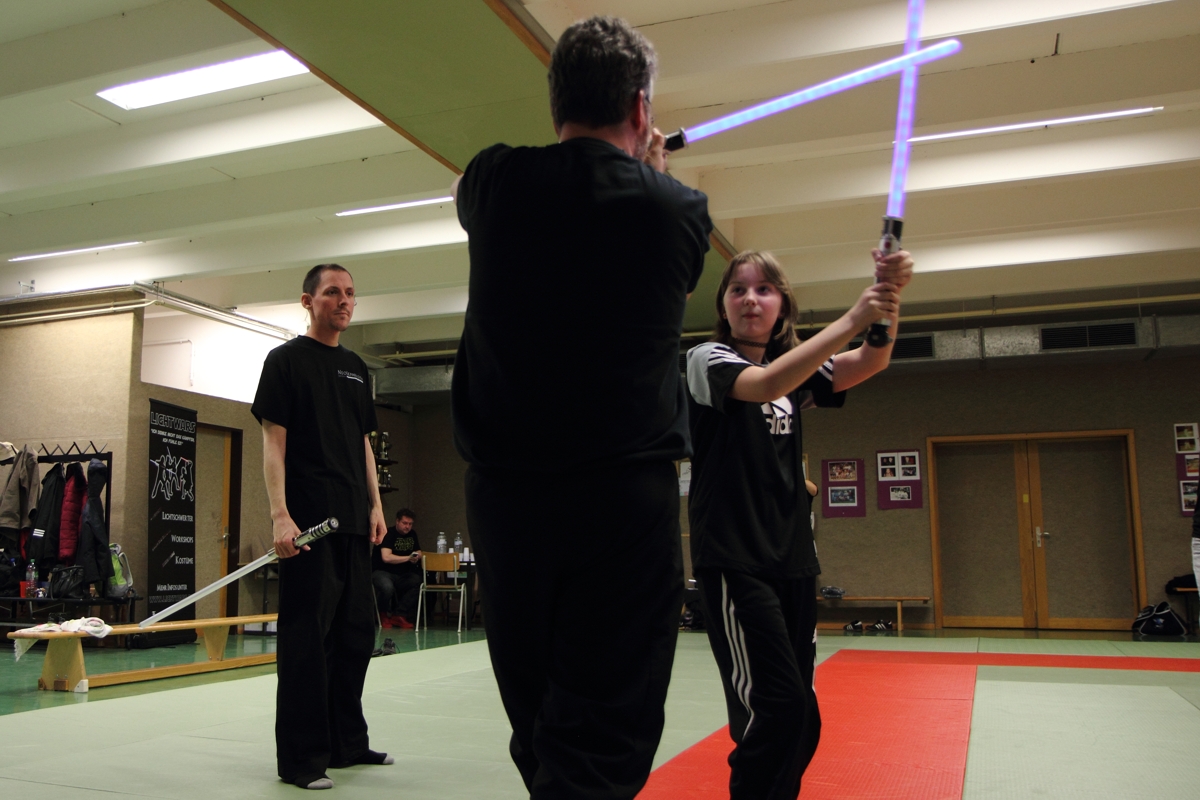 Über die Dauer von etwas mehr als vier Stunden vermittelten wir den Teilnehmern die Grundlagen des Lichtschwertkampfes und der Lichtschwertchoreografie. In einer Reihe aufeinander aufbauender Übungen wurde ihnen vom einfachen Wirbeln bis hin zu komplexen Elementen und Attacken vieles gezeigt, was sogleich mit dem Sparringspartner ausprobiert wurde. Trotz der zeitweise doch stark geforderten Konzentration und der nicht zu verachtenden körperlichen Anstrengung hatten die Teilnehmer einen enormen Spaß. Jeder konnte am Ende auf seine eigene, mit dem Sparringspartner erarbeitete kleine Choreographie zurückblicken. In der Pause referierten wir anhand mitgebrachter Lichtschwertteile über den Zusammenbau unserer selbstgebauten Lichtschwerter und beantworteten bereitwillig Fragen zum diesem Thema.