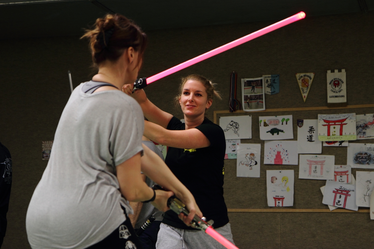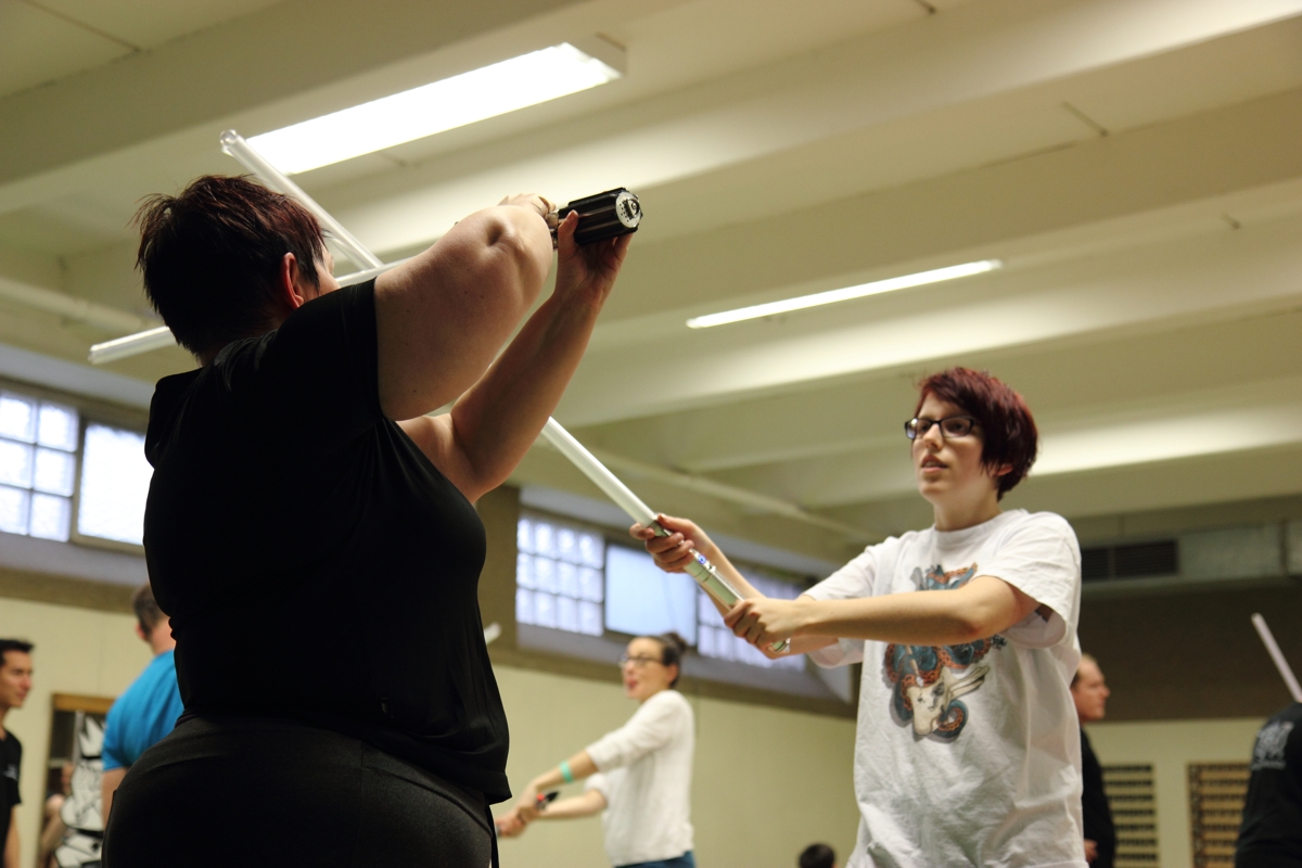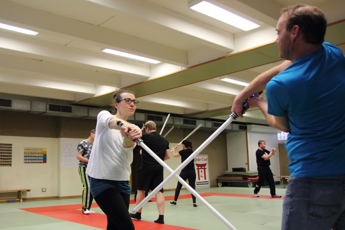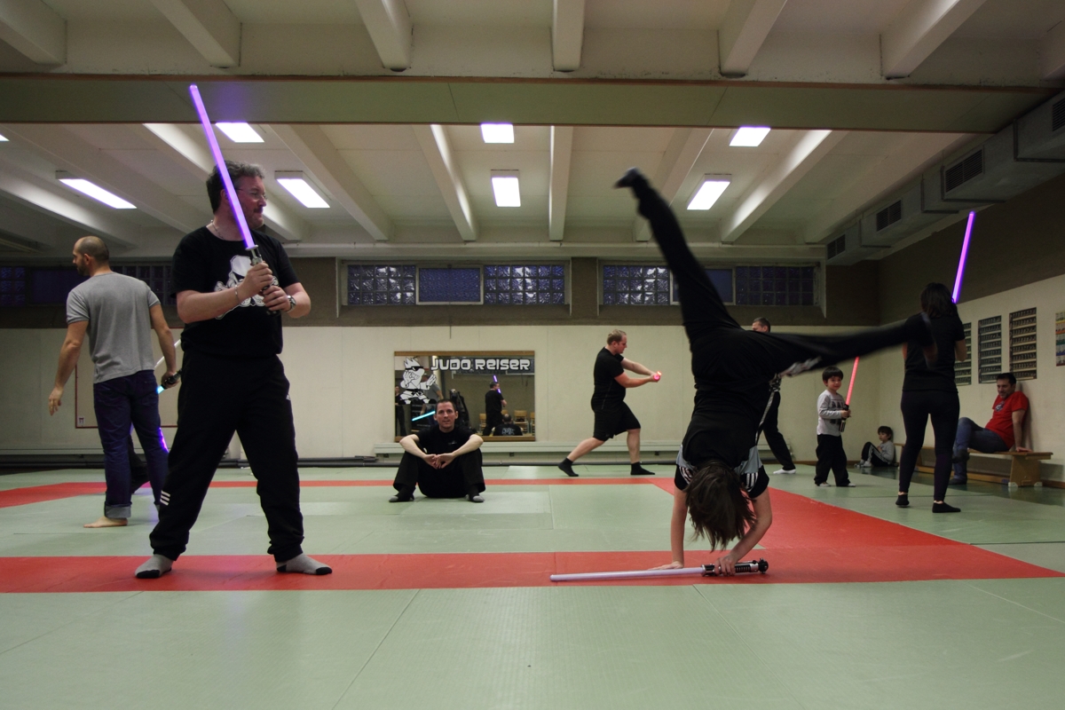 Über die Dauer von etwas mehr als vier Stunden vermittelten wir den Teilnehmern die Grundlagen des Lichtschwertkampfes und der Lichtschwertchoreografie. In einer Reihe aufeinander aufbauender Übungen wurde ihnen vom einfachen Wirbeln bis hin zu komplexen Elementen und Attacken vieles gezeigt, was sogleich mit dem Sparringspartner ausprobiert wurde. Trotz der zeitweise doch stark geforderten Konzentration und der nicht zu verachtenden körperlichen Anstrengung hatten die Teilnehmer einen enormen Spaß. Jeder konnte am Ende auf seine eigene, mit dem Sparringspartner erarbeitete kleine Choreographie zurückblicken. In der Pause referierten wir anhand mitgebrachter Lichtschwertteile über den Zusammenbau unserer selbstgebauten Lichtschwerter und beantworteten bereitwillig Fragen zum diesem Thema.