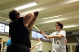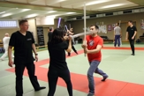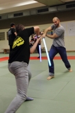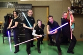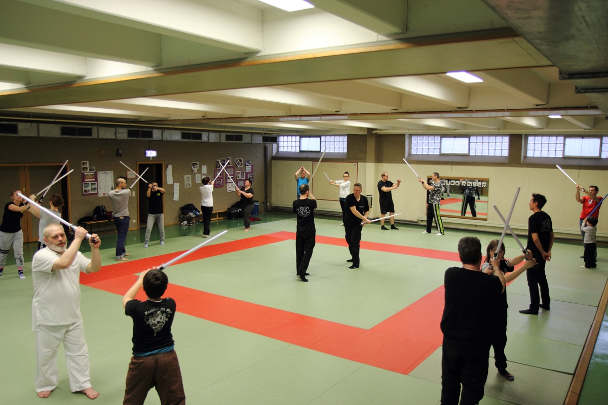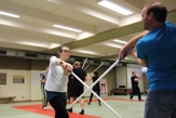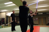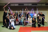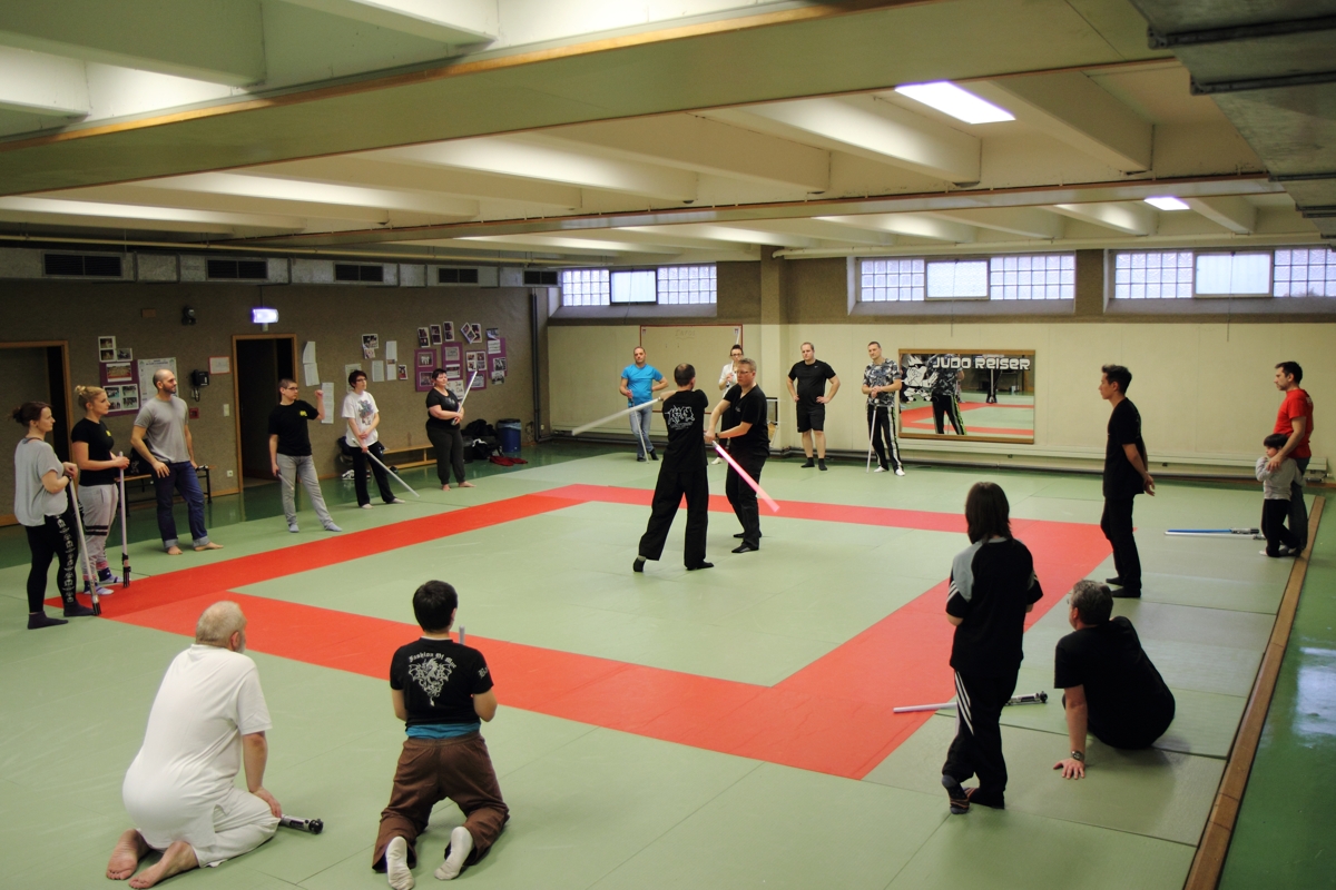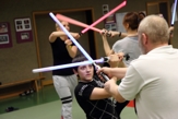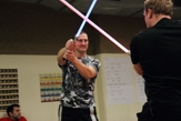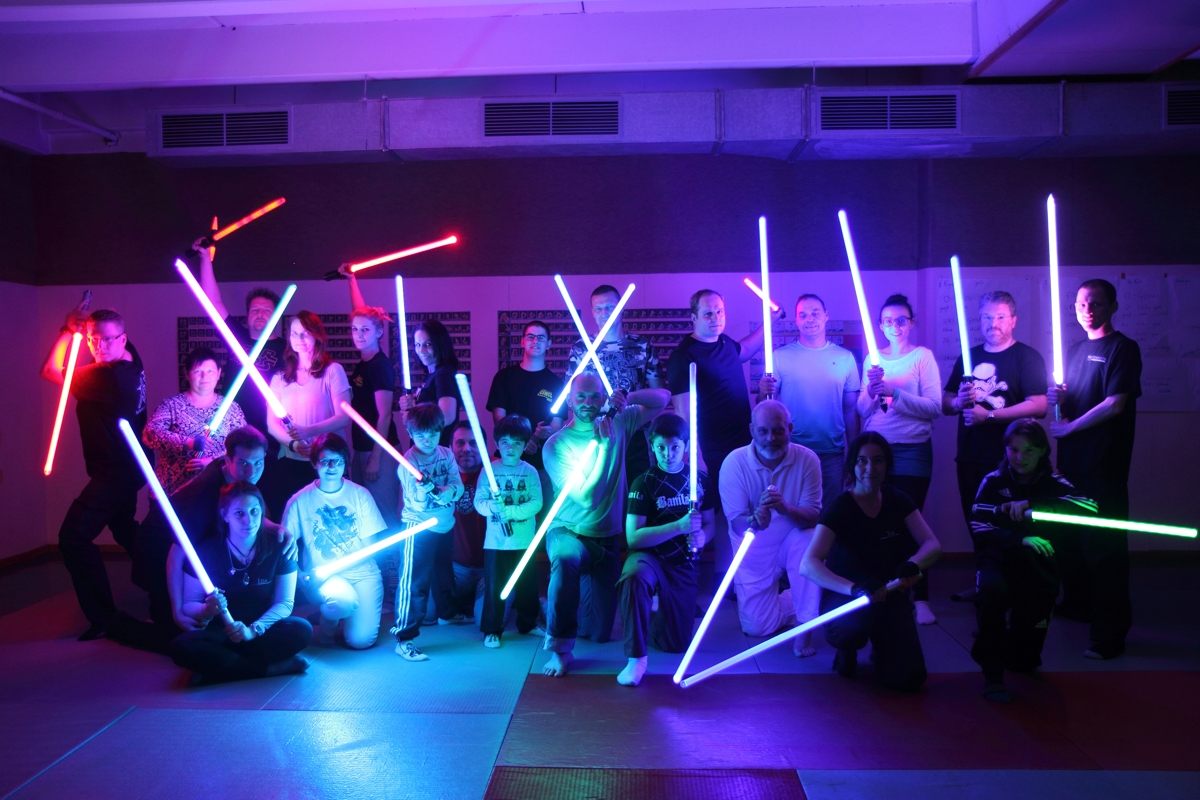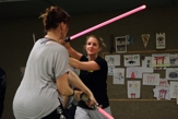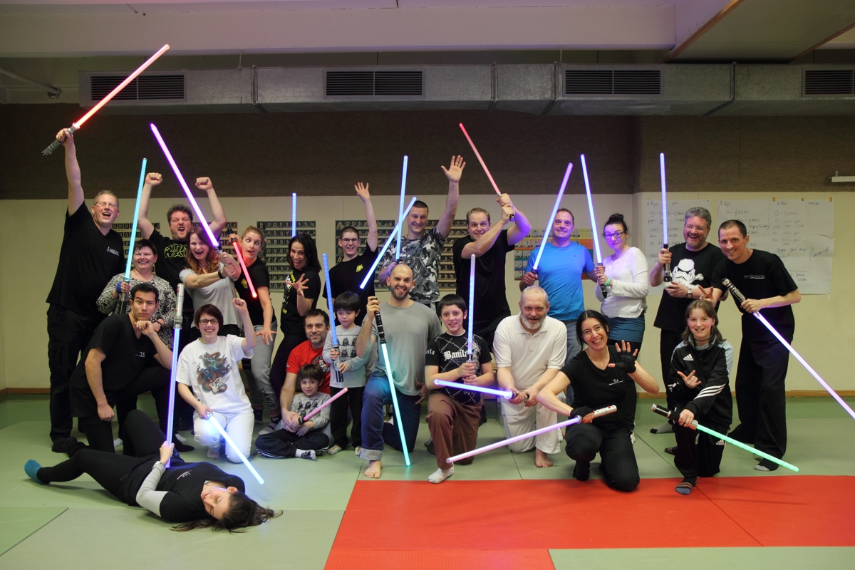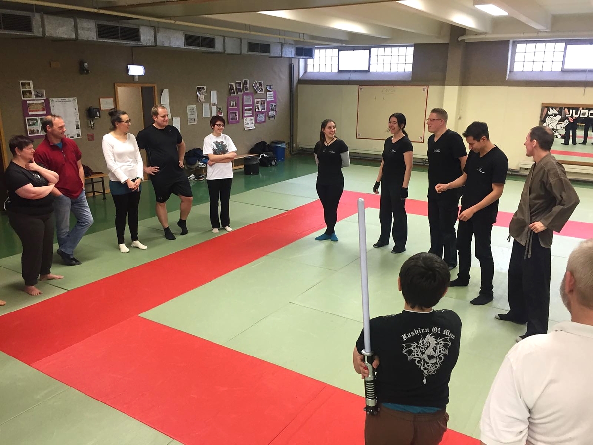 Über die Dauer von etwas mehr als vier Stunden vermittelten wir den Teilnehmern die Grundlagen des Lichtschwertkampfes und der Lichtschwertchoreografie. In einer Reihe aufeinander aufbauender Übungen wurde ihnen vom einfachen Wirbeln bis hin zu komplexen Elementen und Attacken vieles gezeigt, was sogleich mit dem Sparringspartner ausprobiert wurde. Trotz der zeitweise doch stark geforderten Konzentration und der nicht zu verachtenden körperlichen Anstrengung hatten die Teilnehmer einen enormen Spaß. Jeder konnte am Ende auf seine eigene, mit dem Sparringspartner erarbeitete kleine Choreographie zurückblicken. In der Pause referierten wir anhand mitgebrachter Lichtschwertteile über den Zusammenbau unserer selbstgebauten Lichtschwerter und beantworteten bereitwillig Fragen zum diesem Thema.