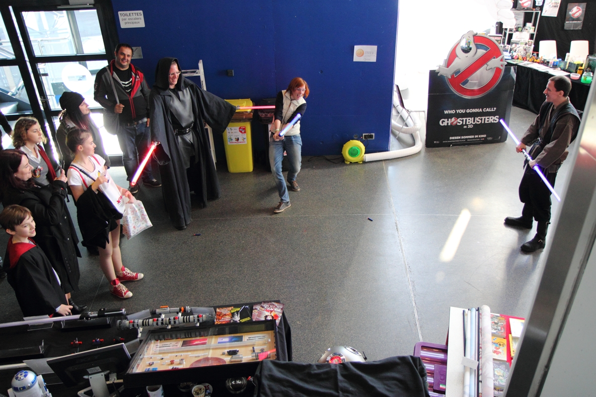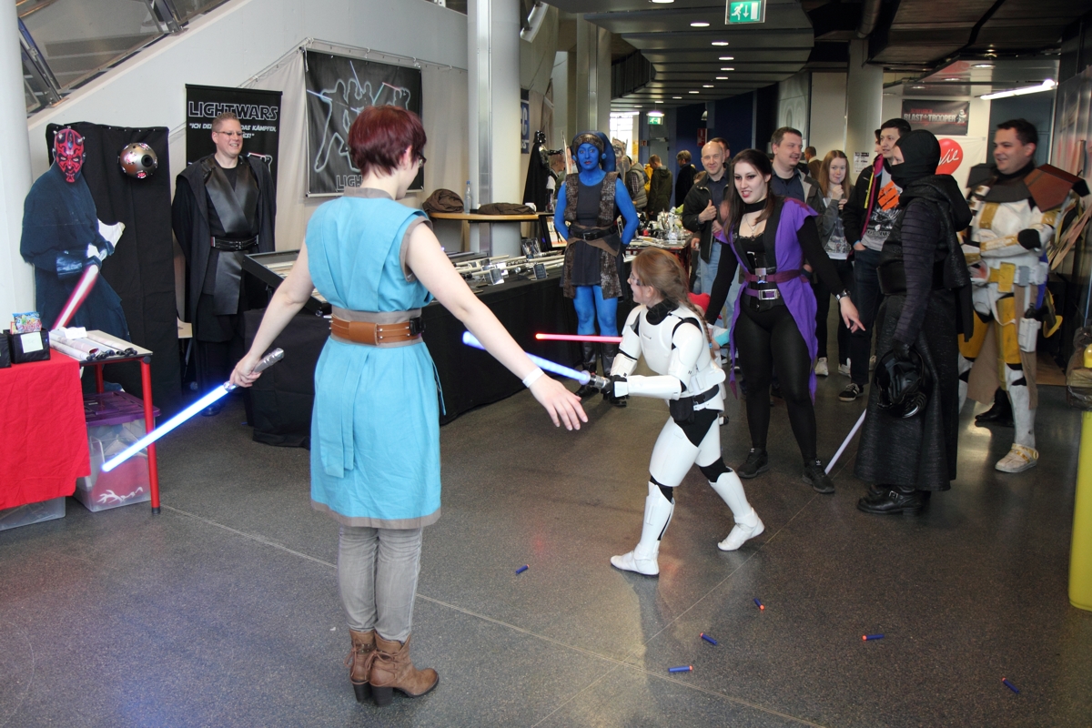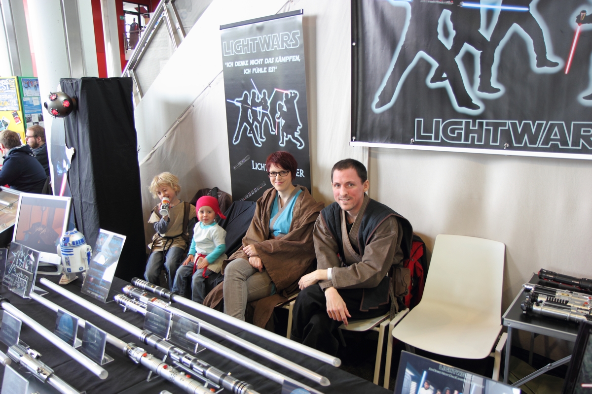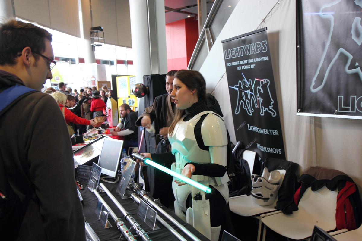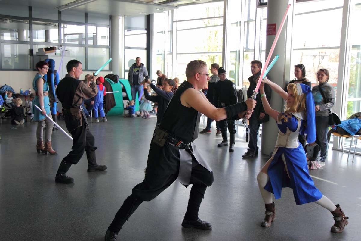 Neben unseren üblichen Auslagen, der Trainingskugel, dem Schaukasten sowie unseren Infovideos zum Schwertbau und Lichtschwertkampf, hatten wir drei neue Schwerter mit im Gepäck, darunter auch endlich Bevardis, das Schwert von TK. In insgesamt drei Workshops, gaben wir Unterricht im Lichtschwertkampf und der Lichtschwertchoreographie, zwei davon samstags und einen sonntags. Bei einem der Samstags-Workshops handelte es sich wieder um den legendären Poolnudel–Workshop, in dem die Kleinsten ihre selbstgebauten Lichtschwerter ausprobieren durften. Tatkräftige Unterstützung während der LuxCon vom Auf-und Abbau unseres Standes über die Beratung von Besuchern in Sachen Lichtschwerter bis hin zur Durchführung der Workshops erhielten wir durch Siara. Sie hat erstmals in allen drei Workshops eine eigene Teilnehmergruppe unterrichtet.