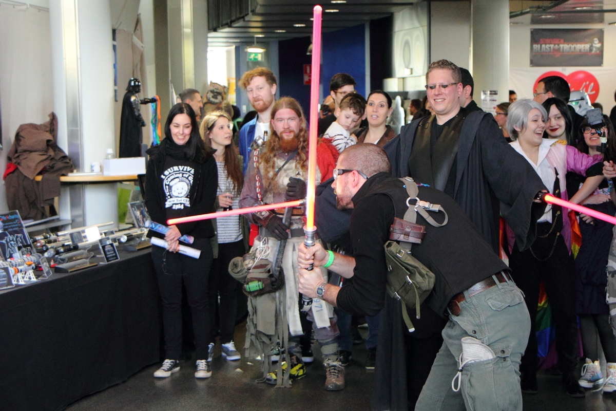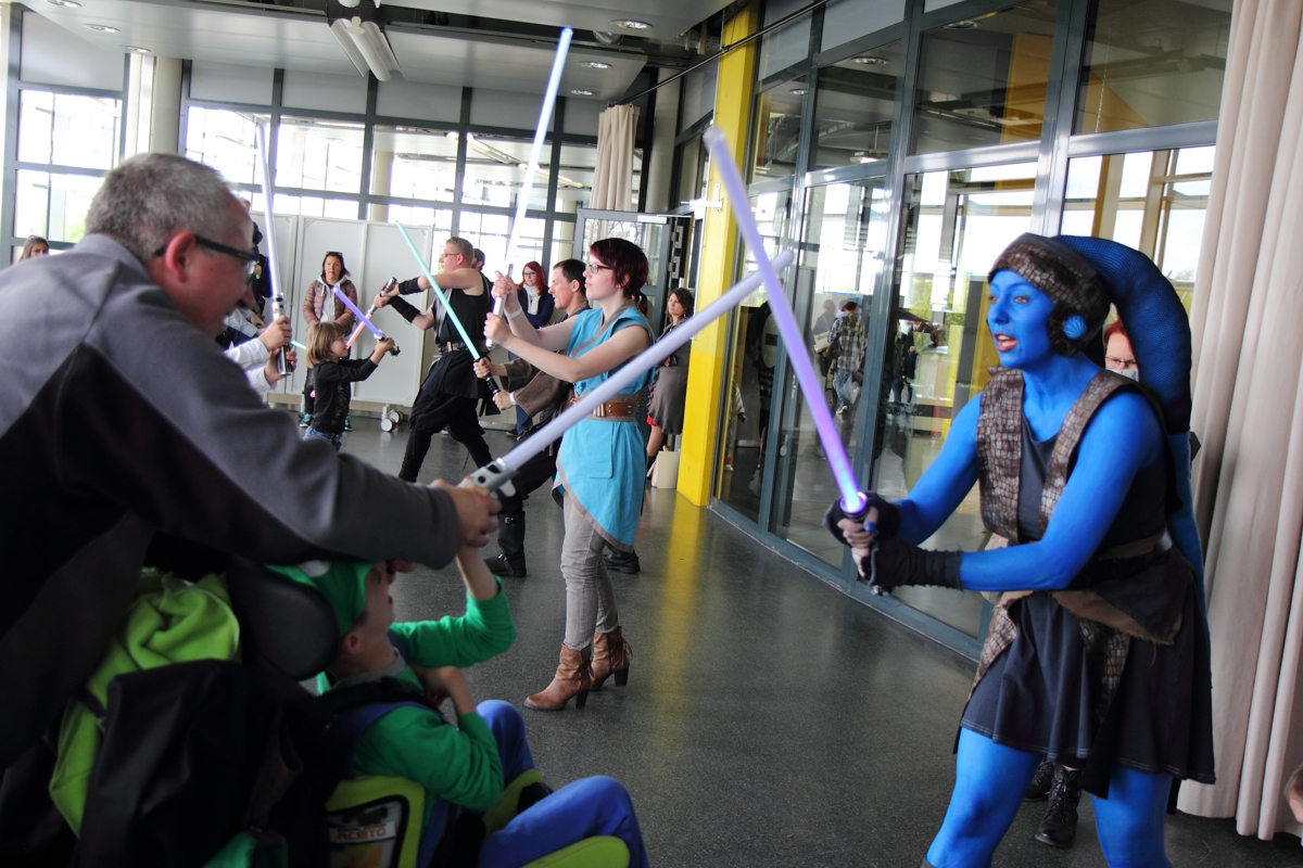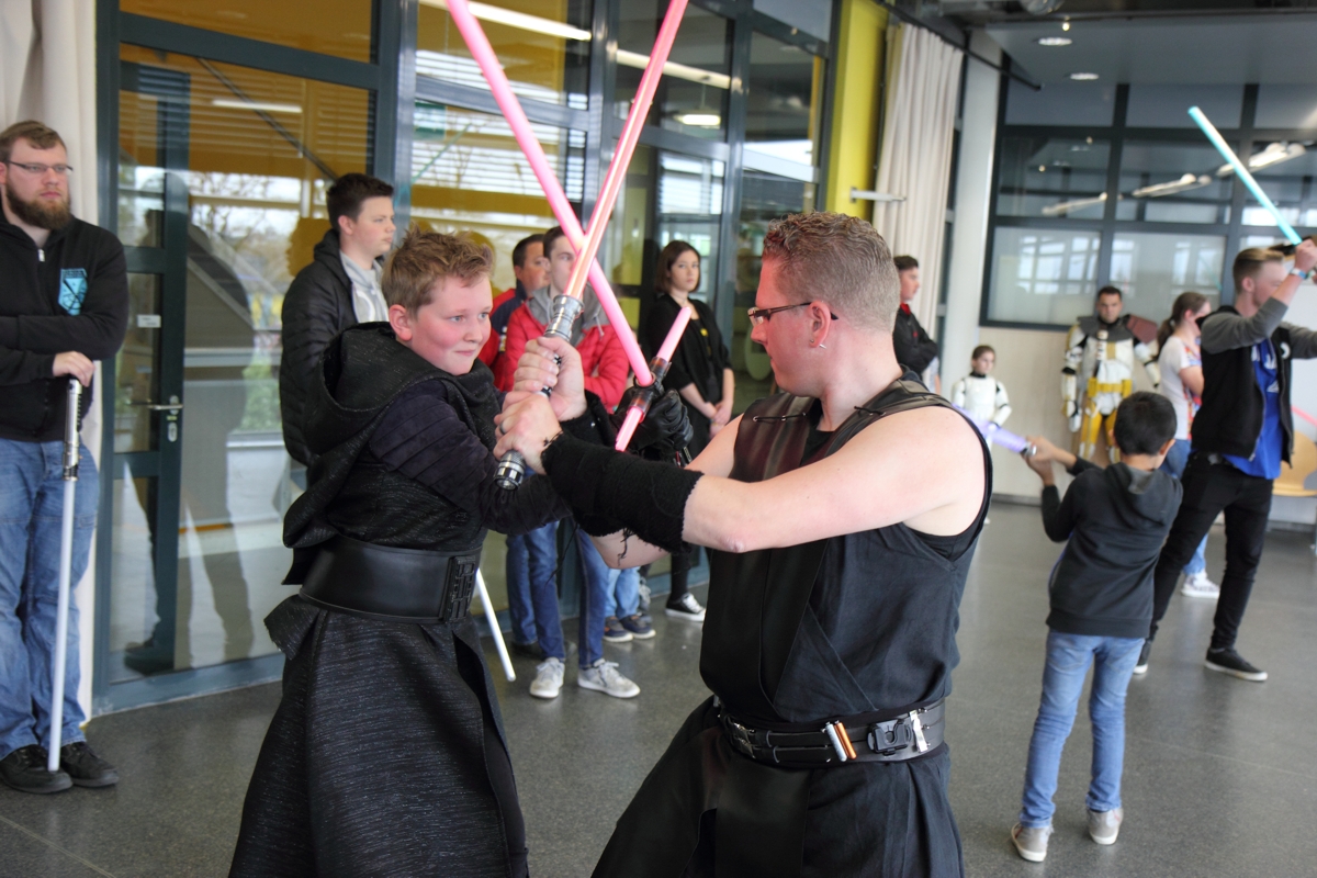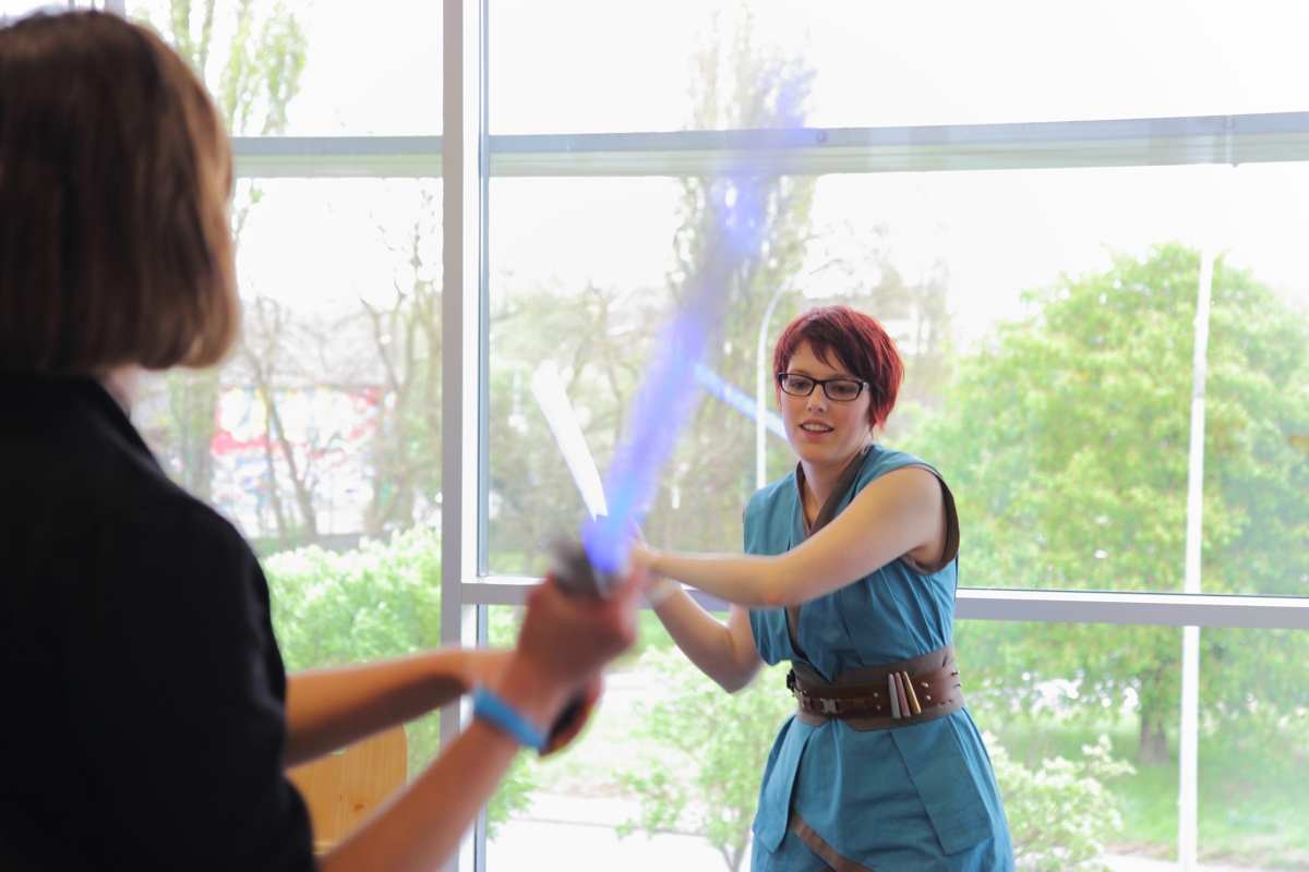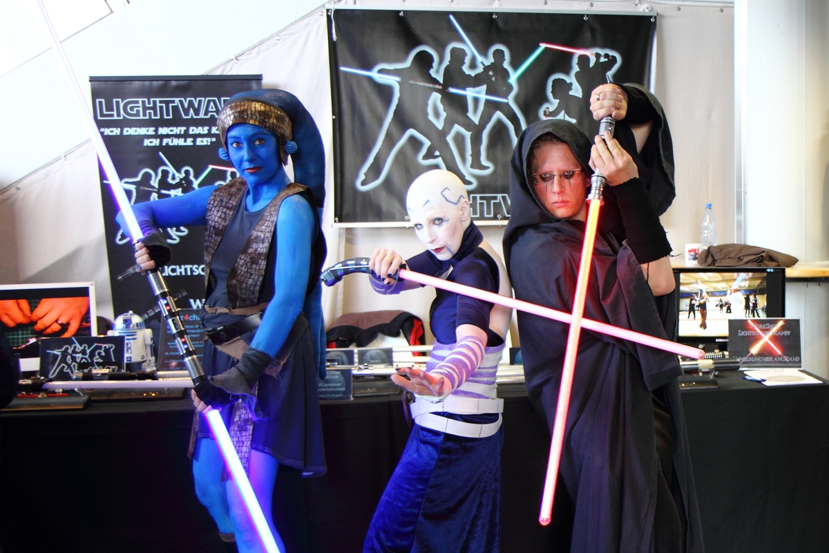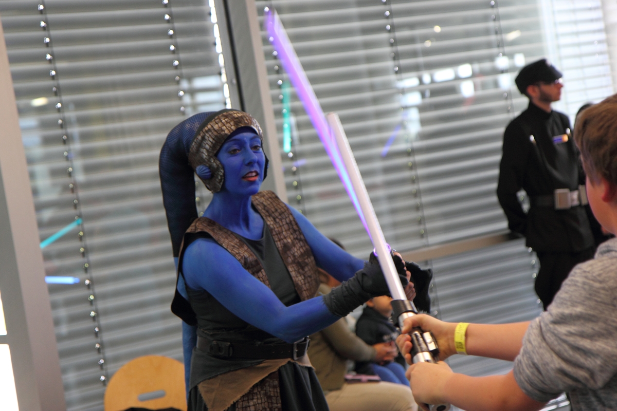 Neben unseren üblichen Auslagen, der Trainingskugel, dem Schaukasten sowie unseren Infovideos zum Schwertbau und Lichtschwertkampf, hatten wir drei neue Schwerter mit im Gepäck, darunter auch endlich Bevardis, das Schwert von TK. In insgesamt drei Workshops, gaben wir Unterricht im Lichtschwertkampf und der Lichtschwertchoreographie, zwei davon samstags und einen sonntags. Bei einem der Samstags-Workshops handelte es sich wieder um den legendären Poolnudel–Workshop, in dem die Kleinsten ihre selbstgebauten Lichtschwerter ausprobieren durften. Tatkräftige Unterstützung während der LuxCon vom Auf-und Abbau unseres Standes über die Beratung von Besuchern in Sachen Lichtschwerter bis hin zur Durchführung der Workshops erhielten wir durch Siara. Sie hat erstmals in allen drei Workshops eine eigene Teilnehmergruppe unterrichtet.