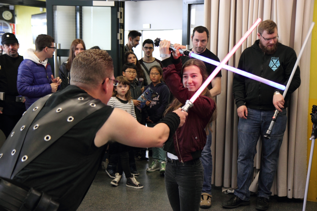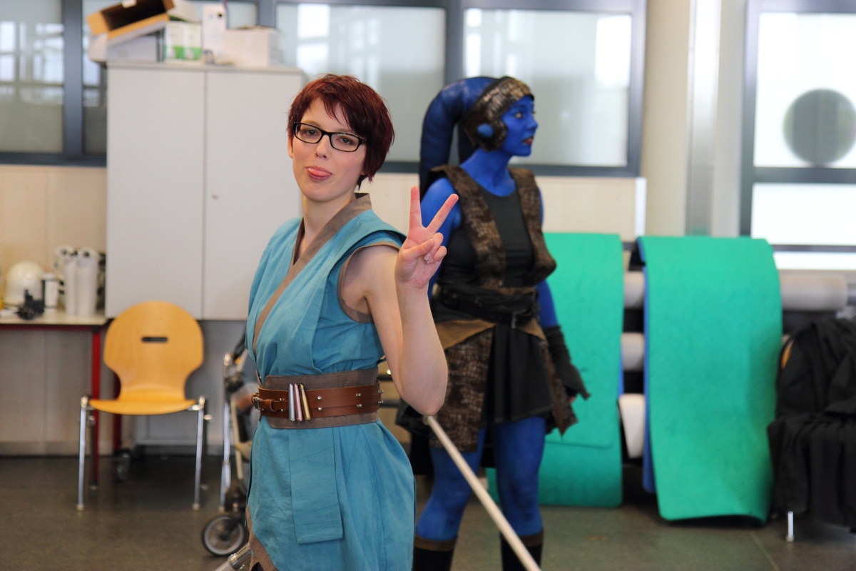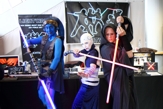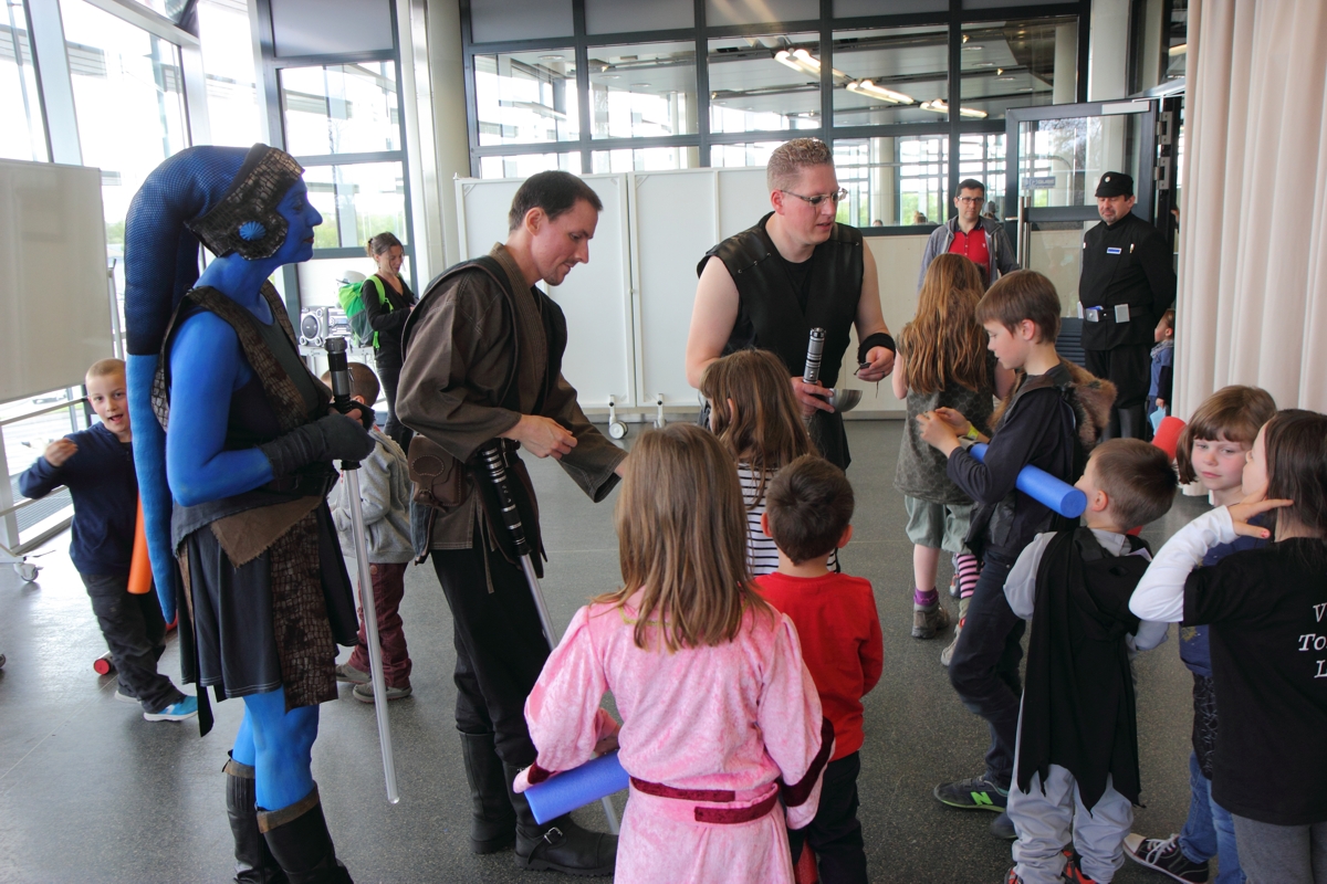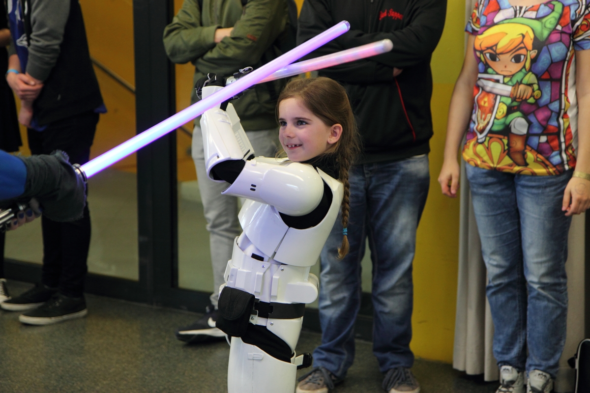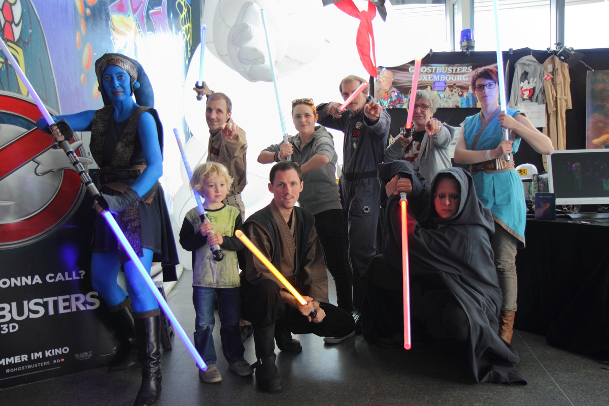 Neben unseren üblichen Auslagen, der Trainingskugel, dem Schaukasten sowie unseren Infovideos zum Schwertbau und Lichtschwertkampf, hatten wir drei neue Schwerter mit im Gepäck, darunter auch endlich Bevardis, das Schwert von TK. In insgesamt drei Workshops, gaben wir Unterricht im Lichtschwertkampf und der Lichtschwertchoreographie, zwei davon samstags und einen sonntags. Bei einem der Samstags-Workshops handelte es sich wieder um den legendären Poolnudel–Workshop, in dem die Kleinsten ihre selbstgebauten Lichtschwerter ausprobieren durften. Tatkräftige Unterstützung während der LuxCon vom Auf-und Abbau unseres Standes über die Beratung von Besuchern in Sachen Lichtschwerter bis hin zur Durchführung der Workshops erhielten wir durch Siara. Sie hat erstmals in allen drei Workshops eine eigene Teilnehmergruppe unterrichtet.