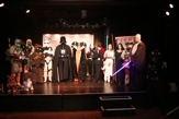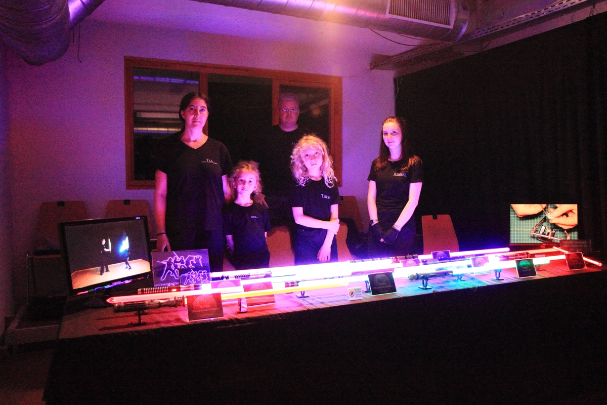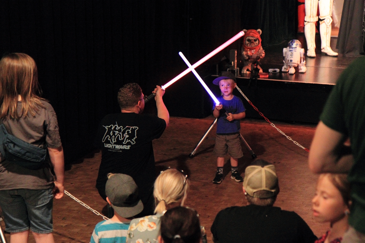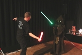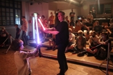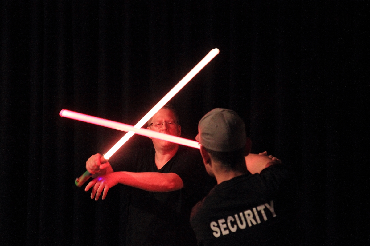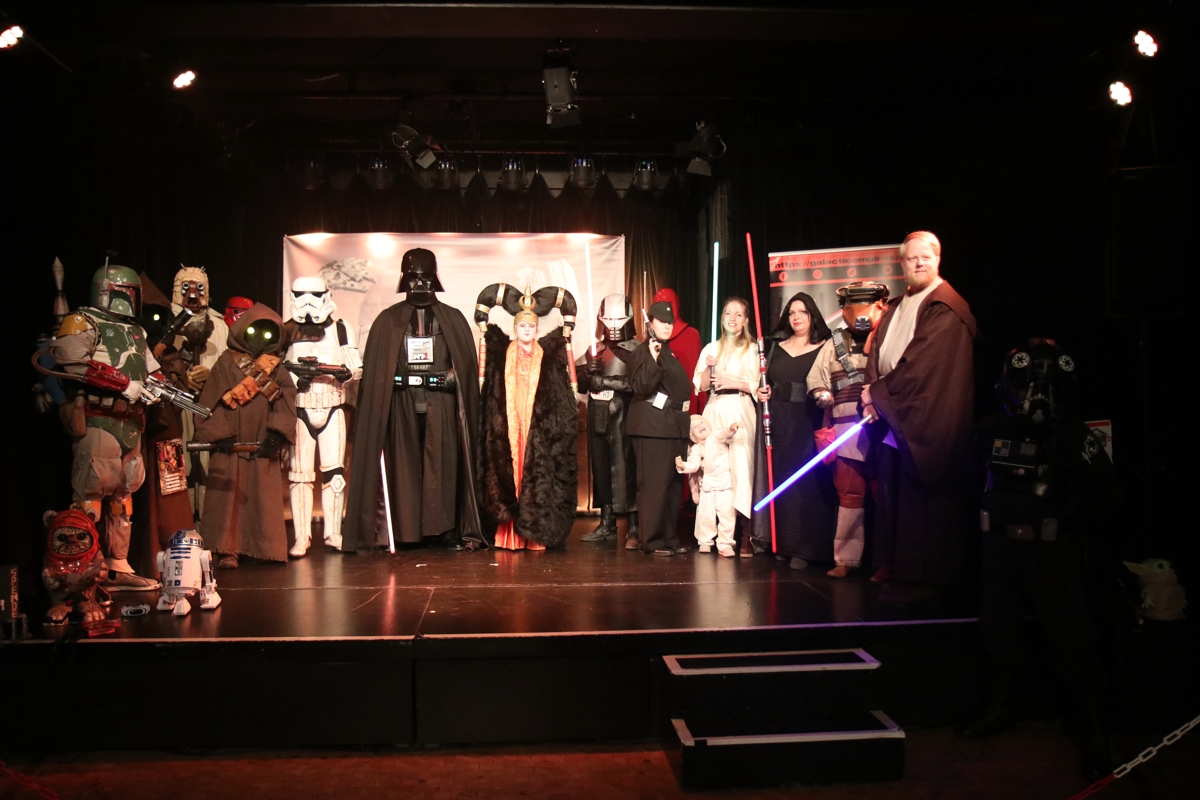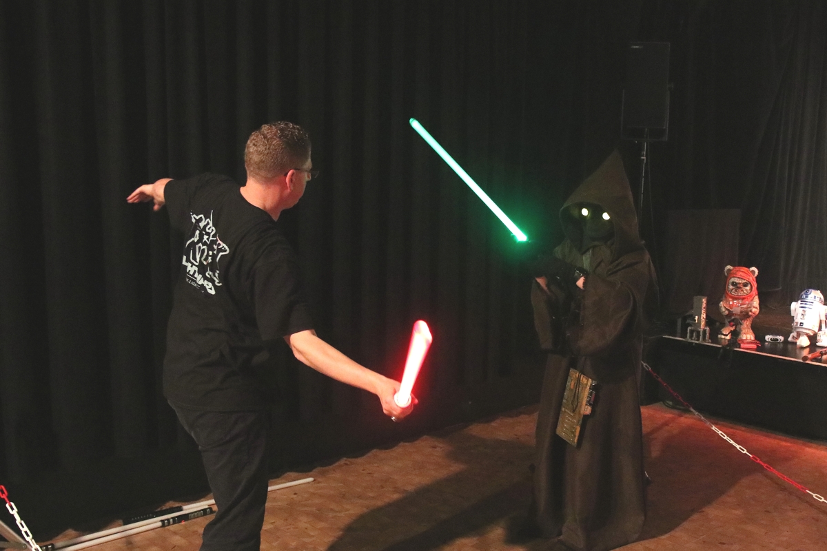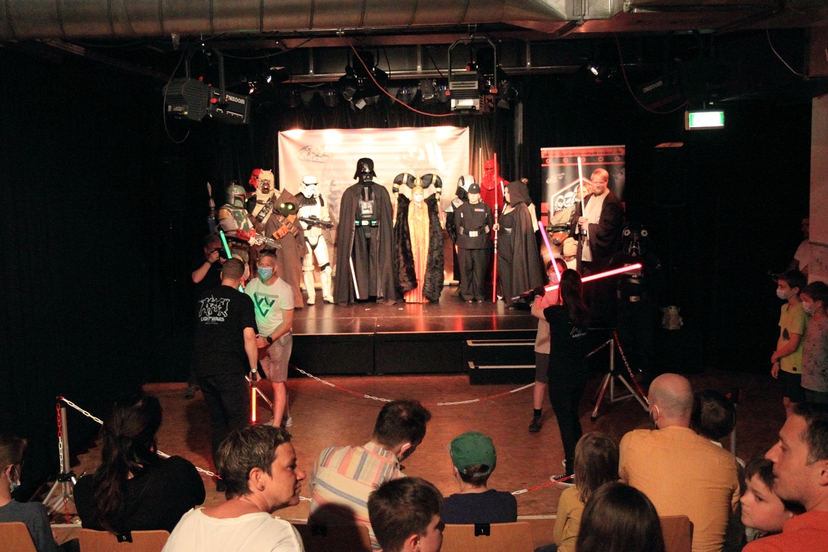 Der kleine Saal der TUFA stand vor dem Konzert ganz im Zeichen von Star Wars. Auf der kleinen Bühne hatte das Galactic Empire Saar neben verschiedenen Exponaten eine Fotoleinwand aufgebaut, bei welcher sich die Besucher mit den Star Wars Charakteren fotografieren lassen konnten. Das Lightwars Team hatte einen kleinen Stand mit Lichtschwertern aufgebaut und trainierte in einem eigens dafür abgesperrten Bereich mit den Besuchern Lichtschwertchoreographie. Der kleine Saal lies an diesem Tag so manches Star Wars Herz der Besucher höher schlagen und alle hatten einen großen Spaß.
