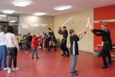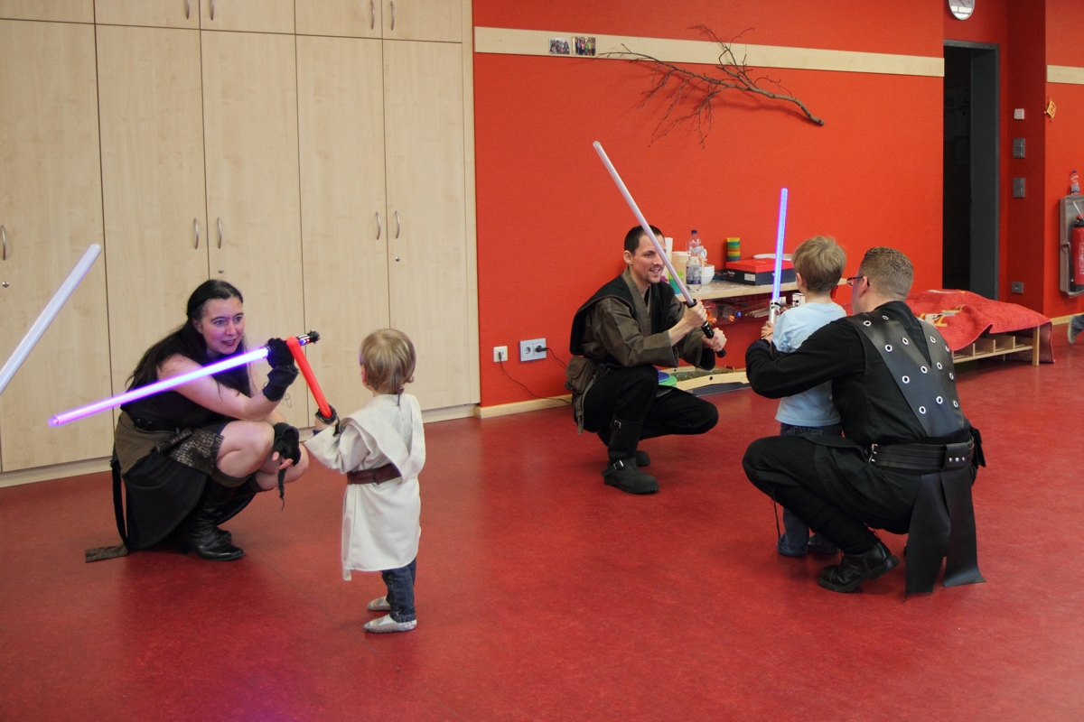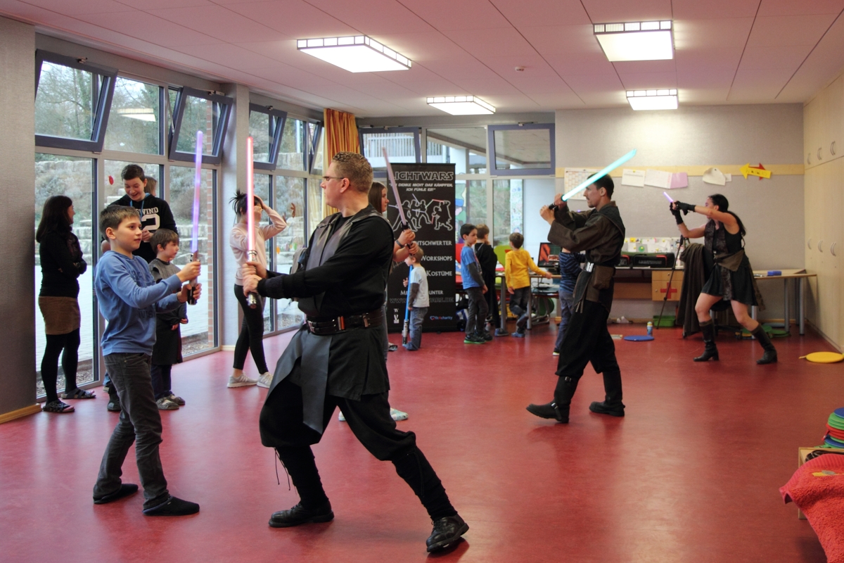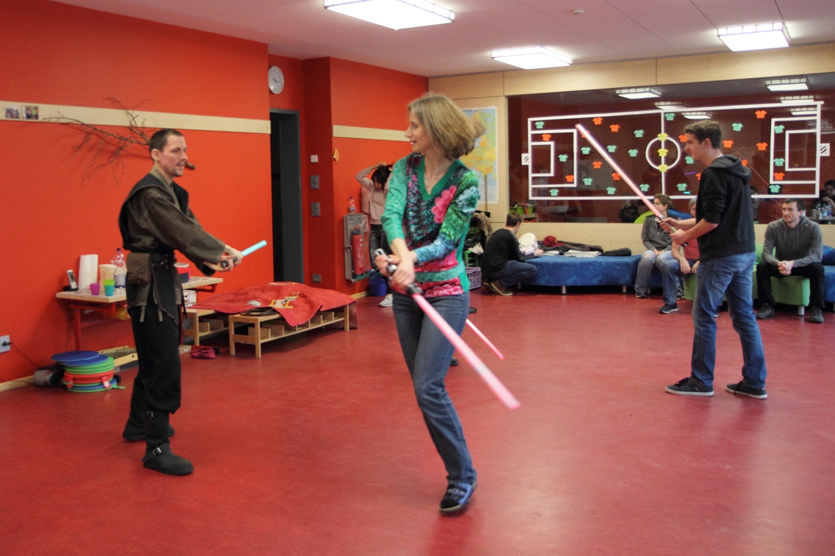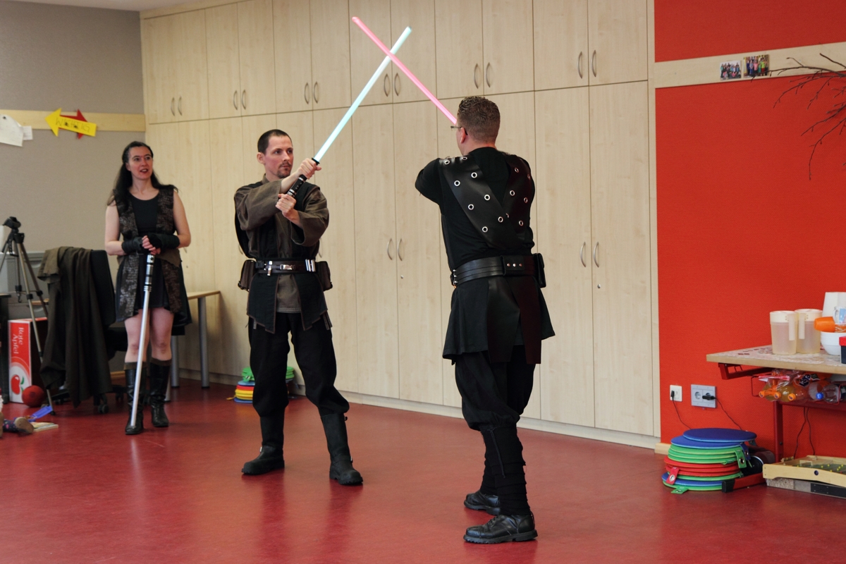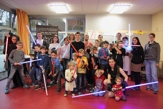 Wir trainierten eine Gruppe von etwa zwanzig Kindern und Jugendlichen im Alter zwischen zwei und sechszehn Jahren. Doch nicht nur diese hatten einen riesen Spaß. Auch einige Eltern ließen es sich nicht nehmen beim Training mitzumachen. Zunächst zeigten wir in unserem Workshop den korrekten Umgang mit dem Lichtschwert und vermittelten die wesentlichen Grundlagen.