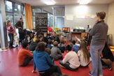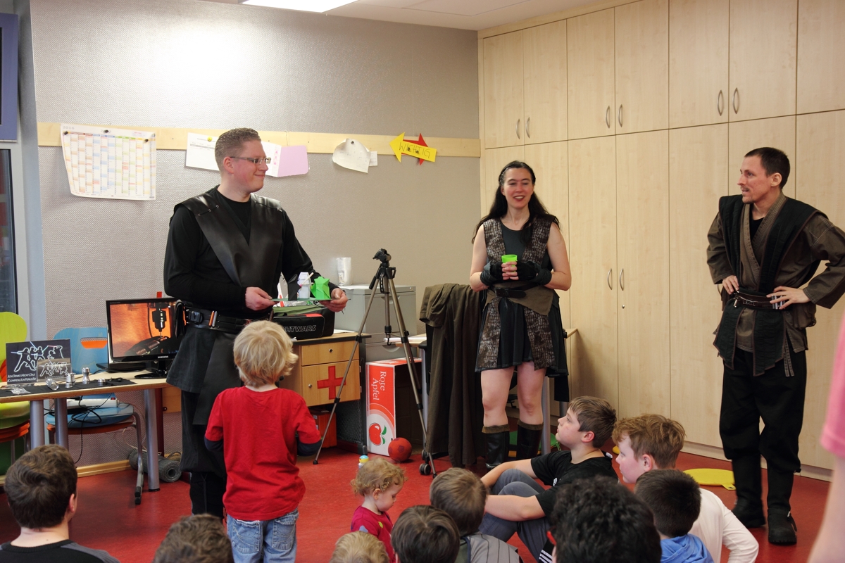 Nach einer kurzen Verschnaufpause, in der für das leiblichen Wohl bestens gesorgt war, wendeten wir uns dann einem eher theoretischen Aspekt zu und sprachen über den Lichtschwertbau. Mit entsprechendem Anschauungsmaterial ausgestattet zeigten wir den Kindern, Jugendlichen und Erwachsenen die einzelnen Bestandteile eines Lichtschwerts und erklärten deren Aufgaben und Funktionen. Die einzelnen Teile wurden von uns herumgereicht, um eine konkrete Vorstellung zu vermitteln. Bereitwillig beantworteten wir die vielen aufkommenden Fragen.