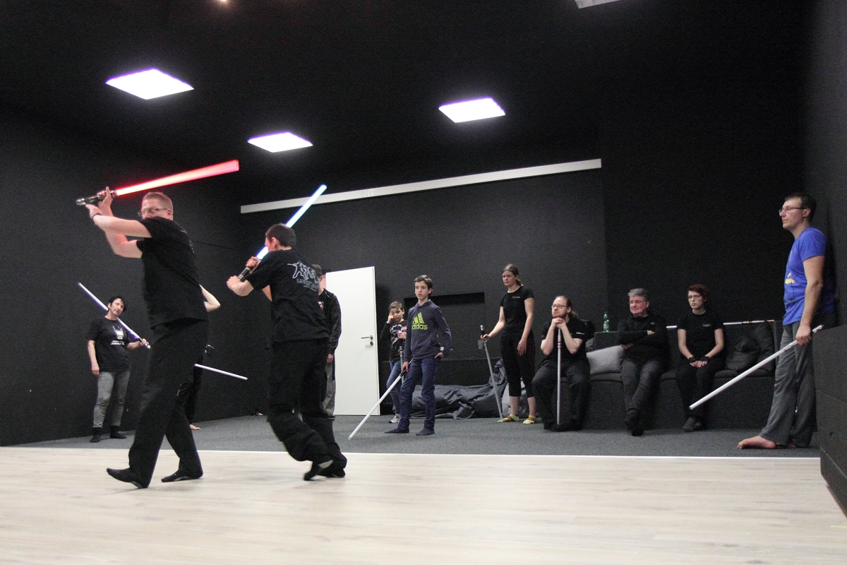 Der Workshop verlief nach bewährtem Schema. Mit den Grundlagen des Lichtschwertkampfes lag der Fokus im ersten Teil wieder auf dem Handling und dem Bewegungsverhalten mit dem Lichtschwert. Den zweiten Teil widmeten wir wie gewohnt den Regeln und Grundlagen einer Choreographie sowie der gemeinsamen Ausgestaltung einer solchen mit dem Sparringpartner. Dabei wurden wieder einzelne beispielhafte Elemente von uns hervorgehoben, vorgeführt und von den Teilnehmern anschließend umgesetzt. Mit großem Eifer dabei, entstanden am Ende wieder sehr schöne Choreographien der Teilnehmer.