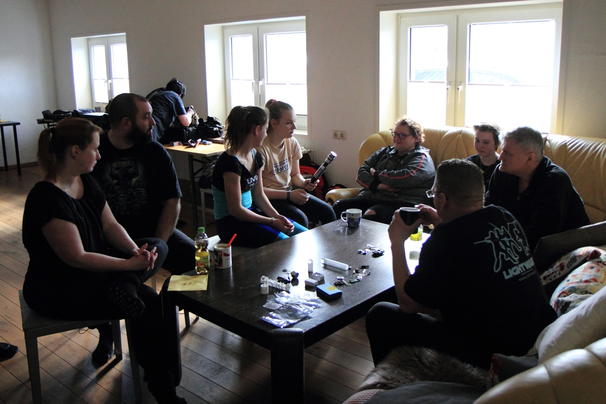 Während der Pause geben wir euch in gemütlicher Runde Einblicke in den Lichtschwertbau. Mit Hilfe der einzelnen Komponenten eines Lichtschwertes erklären wir deren Funktion und veranschaulichen so zum Anfassen den Aufbau von Customlichtschwertern.